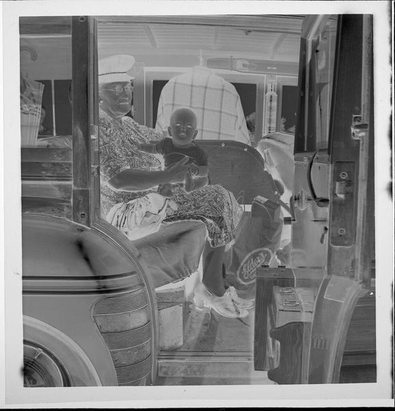 Editor: This is an untitled photograph by Jack Gould, showing a doll in a toy fire truck. There's also a very unsettling sense of implied action. What do you see in this piece? Curator: It feels like a memory, doesn't it? Fragmented, a little bizarre, and deeply personal. The negative image throws the familiar into shadow. Editor: Shadow? Curator: Exactly! Like childhood dreams half-remembered, a toy fire truck and a doll become symbols of something else. Are we witnessing play, or something more staged? Editor: It’s a bit haunting. I hadn't thought of the 'staged' element before. Curator: Photography captures moments, but the artist interprets them. What do you make of the arm reaching down? Editor: An adult playing? Or something else entirely? I’m not sure. Curator: Sometimes, the questions are the art itself, aren't they? It makes you think about all those forgotten moments of childhood.