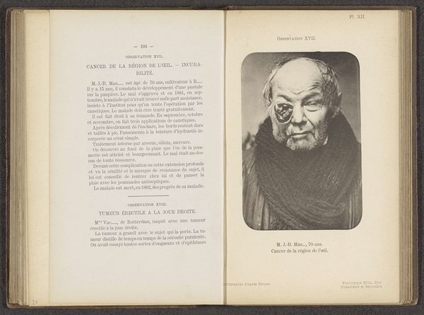 Curator: I see here a photographic reproduction of an engraved portrait of Fra Bartolommeo, dating from before 1863. It's printed on paper and bound in a book, displayed open. The artist responsible for the photo reproduction is Giacomo Brogi. Editor: Right, this image! It's quite striking how the engraving gives the subject such a stern expression. The tight cropping focuses entirely on the face and upper body. I’m curious about its place within history. What's particularly interesting to you about this portrait in its historical context? Curator: Well, let’s consider what it means to reproduce an image of an artist like Fra Bartolommeo, a Renaissance painter, through photography and printmaking in the 19th century. We must look at who this photo was made for, why the photographer thought this image should be made available and for who, considering who controls archives. These things help create collective memories and tastes. Editor: So, you’re saying it’s less about Bartolommeo himself, and more about the image’s role in constructing and distributing artistic and cultural ideas at the time of *its* reproduction? Curator: Exactly. What does choosing *this* artist and *this* portrait say about 19th-century taste and the construction of the "Italian Renaissance"? We must look to social structures. Also notice it’s inside a book. Was this image for the art lover or researcher to admire as part of a bigger collection of historical artifacts? What message did the original maker intend, and what happened to it along the way? Editor: That reframes the image in a completely new way. It makes you question its motivations! Curator: Precisely! The act of reproduction transformed a religious artist into a historical commodity, part of a larger narrative shaped by specific social and cultural forces. Editor: I never considered that reproducing it changed the narrative itself, but it does! Thanks for helping me learn!