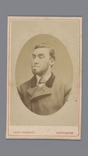 Curator: This is "Portret van een onbekende man," or "Portrait of an Unknown Man" by Albert Greiner, a gelatin silver print created between 1874 and 1887. Editor: It has an enigmatic feel. His slightly averted gaze gives him a certain introspective quality, almost as though he is lost in thought, despite posing for a formal photograph. Curator: Right, studio portraits like this became quite popular amongst the rising middle class. They sought ways to visualize and broadcast their status. The very act of sitting for a portrait speaks volumes about shifting social dynamics and ideas about personhood during that time. Editor: Definitely, it makes you wonder about the circumstances of the sitting. What would his daily life be like? How did he manage to enter the world of image-making that seems almost an exclusive space to enter during this time? It’s these narratives, which speak to class, identity, and representation, that give these types of portrait their depth. Curator: The portrait style is certainly quite standard for that time period, it doesn't particularly make it unique as a work of art in itself but certainly offers glimpses of a different kind when it comes to understanding social life during those times, its social currency made these objects accessible, a way to present one's self. Editor: To think of this man's experiences, aspirations, and potential struggles contained within this fragile silver print, it speaks of lives lived, offering narratives through time. Curator: Absolutely. The photographic image operates as both a historical document and a deeply personal representation. I wonder, what were these portraits displayed as? Who was in possession of the work and did this alter their lives in any possible way? Editor: Indeed, it serves as a tangible connection to a past, real individual and at the same time leaves us with lingering, poignant reminders of shared humanity. It is nice to come to that realization every now and then, when standing still in front of this image.