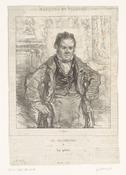 Curator: Oh my, what have we here? Such scandal rendered in lithographic print. It’s Honoré Daumier’s "Man hoort bij de deur zijn vrouw aankomen", from 1837. A real peek into 19th-century Parisian… shall we say, domesticity? Editor: My goodness, it looks like a moment caught entirely off guard. All I see is desperation—maybe a bit of…comic panic? That startled face, practically plastered against the door. The lines feel so urgent, frantic even. Curator: Exactly! Daumier was the master of capturing these fleeting social observations. Remember, this was the era of the rising bourgeoisie. Prints like this weren't just art, they were social commentary, often poking fun at the foibles and hypocrisies of the middle class. It's the era of Balzac in pictorial form, with that acerbic, but knowing, eye for detail. Editor: So this fellow, eavesdropping at the keyhole…is he the subject of that gentle mockery, or do you see a shadow of pathos too? There's vulnerability there as well. I mean, nobody expects to be caught mid-peep, right? Curator: That’s where Daumier’s genius shines. He isn't simply judging, but showing us something universally recognizable about human behavior, even if, in this case, it's, questionable. Plus, consider the medium: lithography allowed for mass production, making this sort of satire incredibly accessible to the public. Editor: And I love the way the background is almost smudged and scribbled, that rough texture contrasting with the crisp detail of his face. It heightens the sense of immediacy, almost like a quick sketch snatched from life. Curator: That rapid execution was intentional, mirroring the fast-paced nature of modern life and the proliferation of images. Think of it as the 19th century's meme culture – a sharp, shareable commentary. It’s exhibited today here in the Rijksmuseum in Amsterdam as part of our larger collection of drawings and prints. Editor: So it is. Seeing the artwork now with this social lens helps see how this character—whoever he might be looking at on the other side of that door—reveals aspects about ourselves as viewers today. Curator: Precisely. The human condition never really changes, does it? Just the peepholes we use to observe it.