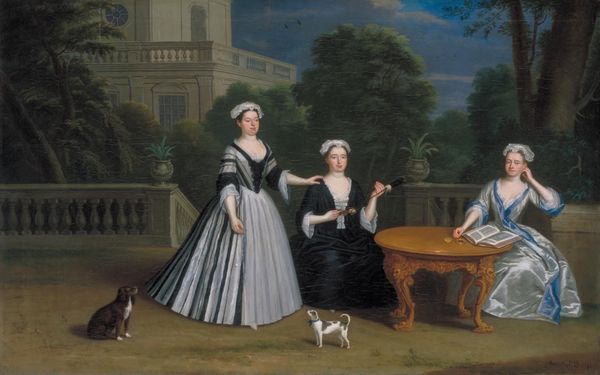 Curator: This is Arthur Devis’ “Members of the Maynard Family in the Park at Waltons,” painted around 1755-1762, rendered in oil on canvas. It is often read as an idealized group portrait. Editor: It strikes me as quite reserved, despite the pastoral setting. Everyone seems carefully posed, almost like figurines placed within a dollhouse landscape. Curator: The composition is incredibly telling, isn't it? Consider the family's positioning in relation to the house. The placement speaks volumes about landed gentry asserting dominance through portraiture and its intersection with property ownership. The leisurely depiction, even the girl collecting flowers, it's all designed to legitimize and naturalize the family's elevated societal standing. Editor: The image is also ripe with traditional imagery of femininity. The daughter with her flowers; the mother playing a stringed instrument—these symbols paint a portrait of virtue and cultivation. Consider too, the subtle presence of the estate itself in the background, evoking power and control in a very particular and culturally recognizable language. Curator: Absolutely. What fascinates me is the Rococo aesthetic’s inherent ties to class and privilege. The elaborate costumes, the contrived elegance; the family aren't presented as naturalistic. There’s an aspirational element on display that reflects societal trends of the time, perhaps revealing the influence of nouveau riche culture on the gentry. Editor: But it feels less flamboyant than, say, a Fragonard. There’s something distinctly English about the muted tones and slightly stiff postures that create a certain type of symbolic presentation of wealth, tradition, and lineage that’s less explicit than many Continental counterparts. Curator: Indeed. It offers an interesting insight into the socio-political narratives that were then becoming cemented. Editor: Seeing through these coded representations is a skill that art can uniquely hone. Thanks to paintings such as these, viewers are handed clues to read how society perpetuates power through image. Curator: Exactly; even if this representation looks subtle at first. Editor: Let us step back and admire the skill of the artist for now.