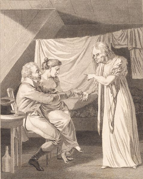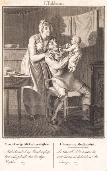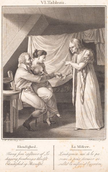 Curator: This is J.F. Clemens’ engraving, "Lotterisedlen," created around 1815 or 1816. It's quite an intimate scene, isn't it? Editor: Intimate, and a little unsettling. There's an almost predatory feel to the woman embracing the younger man. The child looks utterly dejected in the corner. Curator: It’s fascinating to see the detailed work in printmaking from this era. Look at the precise cross-hatching used to create the textures and tonal variations. The materials used in printmaking at the time dictated this careful, linear approach. Editor: I agree, the medium certainly enhances the sharp contrast between light and shadow, amplifying the psychological tension. The woman’s intense expression contrasts sharply with the man's vacant gaze, a stark representation, perhaps, of power dynamics and societal expectations surrounding marriage and financial security in the early 19th century. Curator: Absolutely. The print medium allowed for widespread distribution of such images, and that dissemination raises questions about the accessibility of art and commentary on societal issues for a wider audience at the time. Engravings were a significant part of visual culture, acting almost like newspapers for some. Editor: I see this through a feminist lens. The older woman’s seemingly benevolent act, gifting the lottery ticket, could actually be read as a form of entrapment or control. And note the doll left on the floor in the foreground, discarded almost. Does that speak to the transient nature of female success as merely something one can hold and then dispose of at whim? Curator: Or might the doll simply represent childhood innocence lost amidst the pursuit of fortune? The title suggests that the lottery ticket itself—a symbol of chance and potential upward mobility—is central. Were the production and consumption of these lottery tickets feeding the economy? The raw materials, the paper itself: where did these things come from and who benefitted most? Editor: That's compelling, the lottery as a commodity in itself! But it also invites questions about the socioeconomic anxieties of the period and the accessibility of wealth through a mechanism predicated on pure luck. Think about how systems of inequality impact access, opportunity, even hope itself. Curator: Indeed. And in exploring both the physical production of Clemens' print, alongside the hopes it conveys, and reflects, this engraving becomes such a complex window into that period. Editor: Ultimately, this work is more than a snapshot. It acts as an unsettling mirror, encouraging us to interrogate assumptions around gender, class, and the seductive promise of instant wealth then, and, crucially, now.