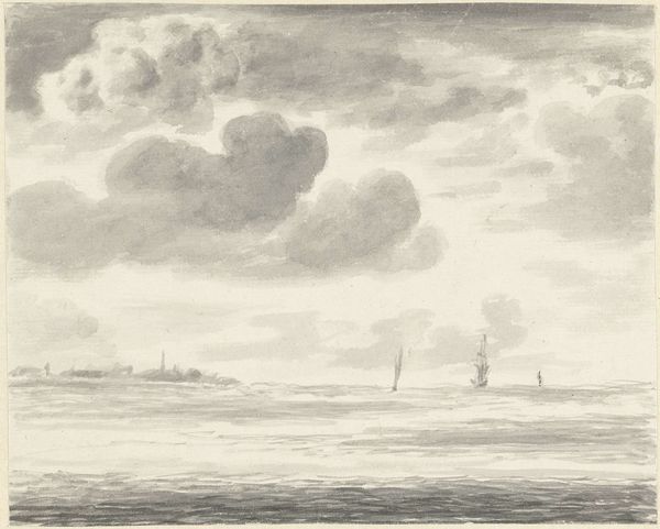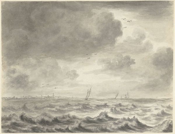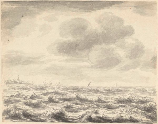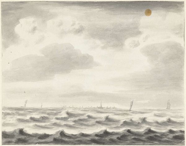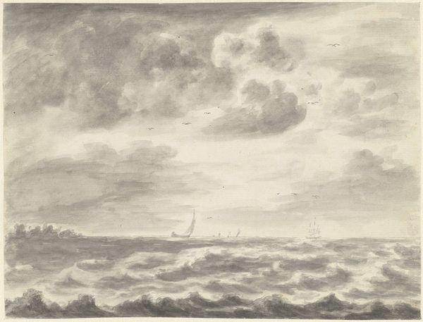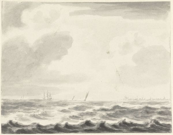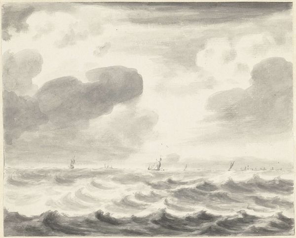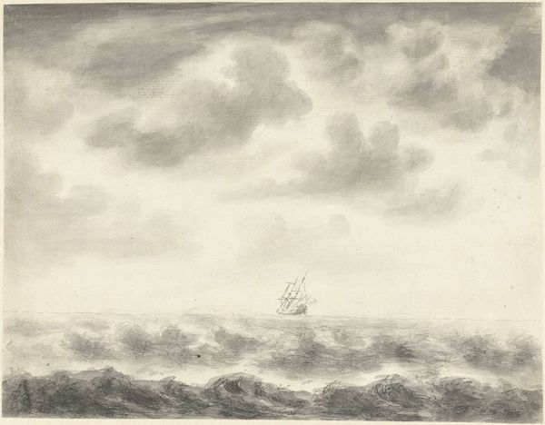 Curator: Immediately striking, isn’t it? A rather brooding composition. Editor: Indeed. What we have here is "Zeegezicht," a pencil drawing, potentially dating between 1708 and 1781, by Pieter Idserts. It is quite evocative. Curator: The texture of the sea is incredible, meticulously rendered with all those quick strokes. The way the light interacts with the waves... it's mesmerizing. What’s your read of the sociocultural context behind an image like this? Editor: Considering the maritime prowess of the Netherlands during that period, it inevitably speaks of the power, the exploration, but also the precariousness of life on the sea. Those small figures on the horizon seem particularly vulnerable against that turbulent sea, it hints at a larger story, doesn’t it? I imagine the drawing represents not only an empirical observation, but also reflects a specific social reality, of those most exposed to these environments. Curator: An astute point. Although simple in subject, there’s undeniable mastery on display with the interplay of light and shadow. Observe how the artist guides the eye from the turbulent foreground to the quiet sky above. The realism grounds this artwork, despite its almost dreamlike, silvery color palette. Editor: Color palettes during that era, often reflected broader social values, no? A somber palette to mirror difficult historical conditions and the values of restraint, reflecting cultural concerns about material wealth during this time. The materiality contributes immensely to its impact. The deliberate and meticulous way the artist uses pencil is itself significant. I'd consider what statements he makes with the conscious choice of media, but there is more research required, of course. Curator: And the realism. Given the subject and time period, that aligns with growing enlightenment ideals— an interest in empirical observation, documentation. It makes a direct reference to nature. Editor: A work rooted in history, but whose stark aesthetic still reverberates today, no? Curator: Certainly a valuable perspective as we try to contextualize such works today.