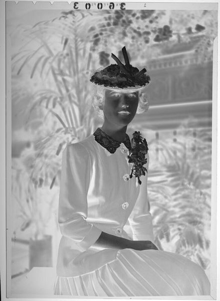 Editor: This silver gelatin print by Jack Gould captures a woman reading aloud at a Women's Club meeting. The inverted tones create an eerie feel. What symbolic weight do you think this image carries? Curator: The negative image, reminiscent of early photographic processes, immediately evokes themes of memory and reversal. The hats, symbols of status and identity, become almost spectral. What cultural narratives might be embedded in this gathering? Editor: Perhaps it signifies a turning point, a hidden history coming to light? Curator: Precisely! The act of reading aloud suggests a sharing of knowledge, potentially challenging societal norms, made all the more potent by the photograph's inverted nature. It becomes a powerful emblem of female intellectual community. Editor: I never considered how the photographic process itself could add to the image's meaning!