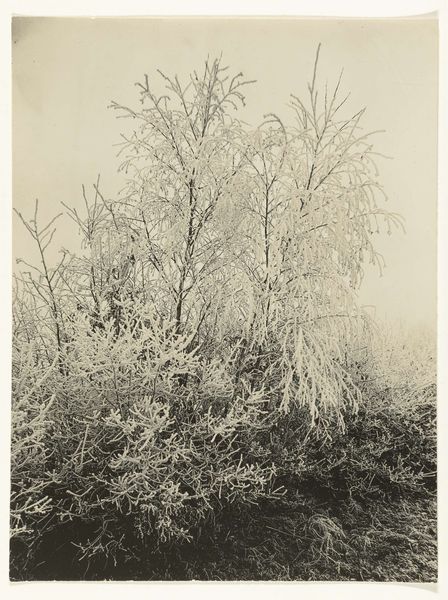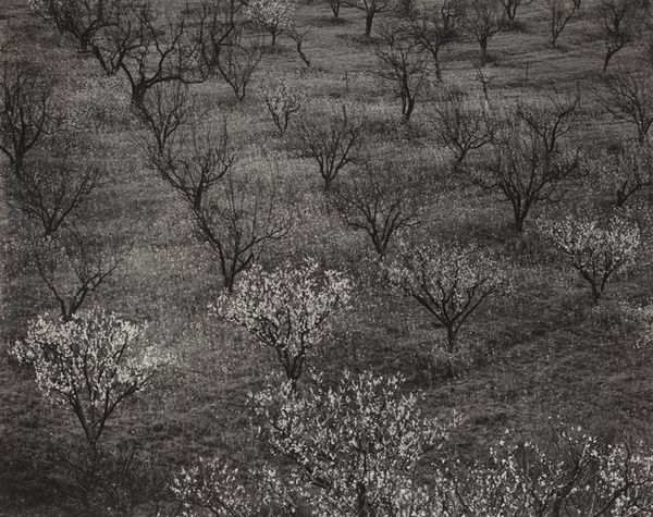 Editor: So this is Ansel Adams’ "Oak Tree, Rain, Sonoma County, California" taken sometime between 1960 and 1980. Looking at it, I'm struck by the contrasting textures - the smooth, almost blurry foreground against the detailed bark of the tree. How do you interpret this work? Curator: Primarily through its formal qualities. The dramatic tonal range, characteristic of Adams’ work, establishes a clear hierarchy. Note the strategic placement of the oak, acting as a central anchor. Its stark silhouette provides a visual counterpoint to the diffuse light, further enhanced by the horizontal thrust of the wooden fence that creates an echo effect that contains all these forces into place. Editor: That's interesting, I hadn't thought about how the fence almost acts as a barrier. What is the importance of using solely black and white photography as a visual form of expressing an image of trees? Curator: The choice of monochrome invites close inspection of the composition. Colour can often distract from pure form and tonal variation. In this context, stripping away colour forces the viewer to appreciate Adams’ mastery of light and shadow, creating a structured contrast across forms. Do you agree with my formalist interpretation? Editor: Absolutely. Focusing on the relationship between those formal elements helps to bring out so many of the image’s complexities. Curator: Precisely. Considering the formal components is key, because it reveals intentional composition in photographic pieces such as this. Editor: Thanks for expanding my view on that, this formal breakdown certainly made the picture easier to approach and unpack as a photograph.