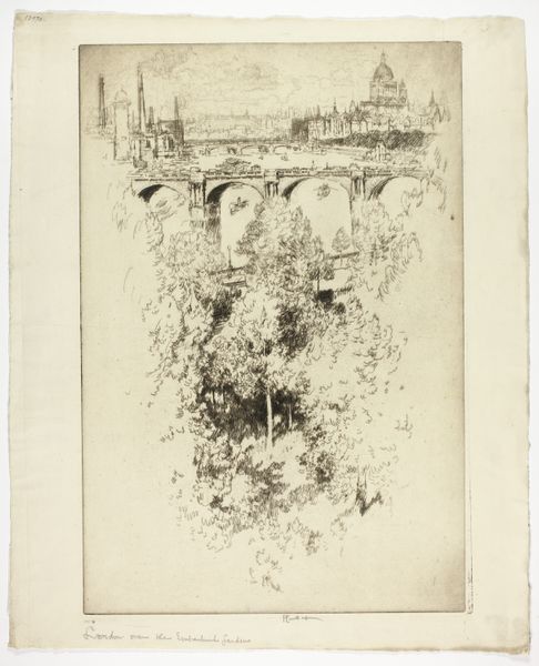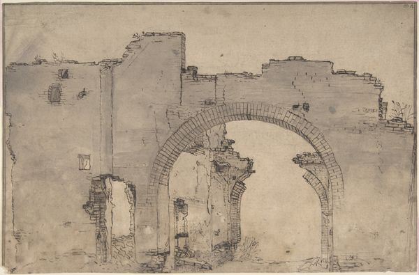 Curator: Ah, there's something hauntingly beautiful about this… like a faded photograph. Editor: Indeed. What we have here is "Ruins of Archway," a graphite drawing on paper, circa 1827, by Richard Parkes Bonington. Currently residing at The Art Institute of Chicago. Curator: That title feels insufficient somehow. It suggests mere architecture, but the emotional weight feels so much deeper. It is an archway, sure, but the ruins pulse with absence and yearning. Editor: Structurally, the arch acts as a framing device. The foreground—rife with delicate, almost feverish graphite marks depicting dense vegetation—creates a dynamic tension with the static geometry of the arch itself. Notice how Bonington manipulates line weight. The arch's edges are firm, definable, compared to the blurry, ephemeral quality of the flora. This reinforces the sense of a decaying structure slowly being reclaimed by nature. Curator: Beautifully put. Reclaimed… or perhaps the ruins are themselves gestating, being reborn as foliage. The darkness within the arch hints at endless, unseen possibility. What secrets are those shadows hiding, or nurturing? And consider the Romanticism…this isn't a pristine monument, it's an organic collapse. Editor: Absolutely. And further, there's a dialectic at play here, the rational, man-made structure versus the wild, untamed elements. The arch's curve mirrors and is countered by the sinuous forms of the plants. Consider how the light filtering through illuminates patches within the foliage while casting others in deep shadow… it creates depth but also a subtle psychological unease. Curator: You know, I see the remnants of an almost whimsical touch—a certain delicacy in the drawing which contrasts strangely with the heaviness of the subject matter. Is it a celebration of decay or a mourning? It’s suspended in a melancholic uncertainty. I bet if you could walk through, you would just step into memory. Editor: A striking thought. In summary, the composition skillfully oscillates between clarity and ambiguity, between solidity and ephemerality. A romantic paradox that is very becoming in our current moment of reckoning with the human imprint. Curator: It speaks volumes. Even now.