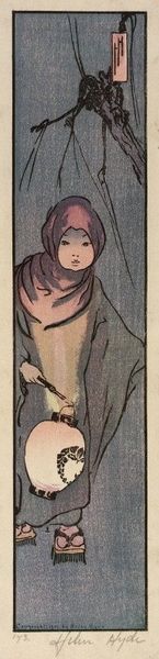 Curator: Looking at this work, I immediately notice the intriguing combination of soft colors against the stark black. There’s a palpable sense of contained joy and perhaps a hint of formality. Editor: Indeed. Here we have "In Their Holiday Clothes," a 1914 woodblock print by Helen Hyde. Hyde, an American artist, was deeply influenced by Japanese Ukiyo-e prints, and you can see that clearly here in the linear composition and flat planes of color. Curator: The composition is so direct. The artist doesn’t waste a single stroke. Tell me, how does this piece fit within the context of cultural exchange at the time? Editor: That's a great question. Hyde's work reflects a broader fascination in the West with Asian art and culture in the early 20th century. However, it's not without its complexities. While admiring, her depictions could sometimes fall into orientalist tropes, idealizing and perhaps simplifying Eastern cultures for a Western audience. Curator: Interesting! Observe the arrangement of the figures. There's a clear hierarchy, a visual metaphor for family structure, wouldn't you say? Also, the background – it is so restrained, it forces your eye to focus only on these figures in the foreground. Editor: Absolutely. And the figures’ clothing is really interesting; each family member carefully arranged within the frame. And the expressions of the faces, how each one is unique. But I must ask, can we look past that surface beauty to find evidence of an asymmetrical dynamic present here? Curator: Ah, a deeper, sociopolitical reading! That’s fair. The subtle gradations of tone achieved through the woodblock technique create an incredibly gentle visual texture that softens what might have been more pointed commentary. Editor: Exactly. Overall, it is still quite powerful for something with these kinds of inherent cultural limitations. Hyde really does give us much to consider, doesn’t she? Curator: It's a wonderful example of how aesthetic admiration and critical inquiry can coexist.