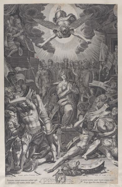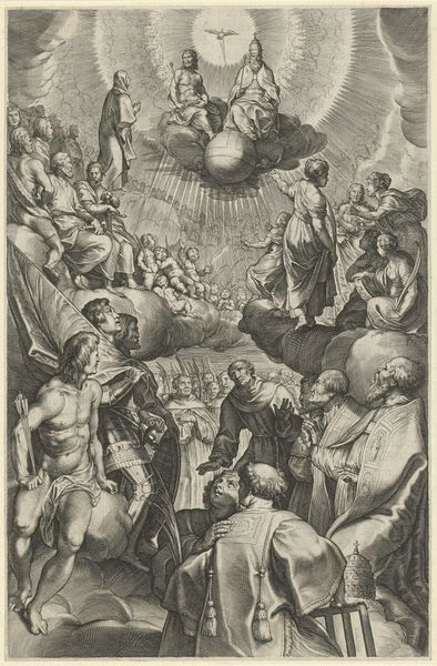 Curator: The "Annunciation to the Shepherds by Angelic Choirs," an engraving completed in 1587 by Johann Sadeler I, now resides in the Rijksmuseum. Look at how this intricate print unfolds a story of the divine meeting the pastoral. What is your first reaction to the composition? Editor: Overwhelmed, yet strangely comforted. The scale feels vast, with heaven breaking open, but the line work and dense layering also feel meticulously controlled and intimate, like a miniature drama playing out on a grand stage. It seems like organized chaos. Curator: The composition employs a strong vertical axis. From the heavenly host at the top to the startled shepherds below, a clear hierarchy is established. Note the symbolic use of light emanating from above, illuminating the scene and drawing our eye through the narrative. How might we interpret that shaft of light, or that sense of illumination? Editor: Well, beyond the obvious religious connotations, that visual hierarchy interests me, particularly the shepherd’s reaction below: fearful and perhaps uncomprehending of this announcement. Is this division purely celebratory or a more critical commentary on social strata, the divide between the divine message and the lives of those who receive it? Are they really equipped to even comprehend what they're witnessing? Curator: Indeed, Sadeler's Northern Renaissance style integrates both detailed observation and symbolic representation. The angelic figures are rendered with classical grace, while the landscape shows attention to naturalistic detail typical of the era. We also should note the placards the angels bear: sheets of music. The announcement of peace delivered in glorious harmony. Editor: Those musical notations underscore the sense of order and divine harmony, contrasting rather sharply with the rustic, earthly chaos below. And I think that in terms of interpretation it’s difficult to not consider the implications of such strong hierarchies given the rising power of mercantile class in the North at this point, the religious wars – who got to receive heavenly grace? I am not sure the artwork gives any conclusive answers to these kinds of issues but that's okay too, right? Curator: Ultimately, Sadeler leaves us to contemplate the mysteries of faith, the power of divine intervention in the mundane, and the intricate tapestry of artistic expression. The details reveal much upon closer inspection. Editor: It's more than just a pretty picture; it's an invitation to engage with questions about belief, social structure, and artistic intention, which hopefully sparks necessary conversations, as well.