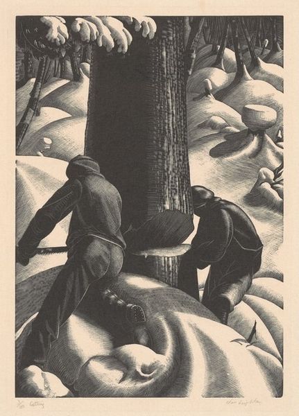 Clare Leighton made this wood engraving, "Corn Husking in the Mountains," using knives and gouges to carve into the block, a real process of removal and reduction. The stark contrast of black and white creates a dramatic visual impact. Look at how Leighton uses dense, rhythmic lines to define forms and textures. The undulating lines on the hills in the background give a sense of depth and movement, while the intricate patterns on the corn stalks add a tactile quality. Notice the figure on the right: See how the lines of the skirt are etched to give an almost topographic sense of the folds of the fabric? Leighton’s choice of wood engraving lends a certain graphic quality to the image that reminds me of the German Expressionist woodcuts of artists like Kathe Kollwitz, where the medium itself becomes part of the emotional message. Just like those works, Leighton's print invites us to think about the relationship between labor, landscape, and the human condition. It’s a reminder that art is an ongoing dialogue, each artist building upon the ideas of those who came before.