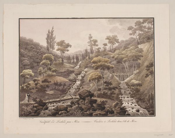 Editor: This is "Et kapel ved Liselund på Møen," or "A chapel near Liselund on Møn," created in 1805. It appears to be a print – possibly an etching with watercolor – and it depicts a small chapel nestled in a picturesque, almost idyllic landscape. The colors are quite muted and soft, giving it a tranquil feel. What can you tell me about this piece? Curator: This work gives us insight into the romanticization of nature and the emergence of national identity in early 19th-century Denmark. Picturesque landscapes became a vehicle for exploring cultural values. Do you notice how the chapel isn't just a religious structure, but integrated harmoniously with the landscape, reflecting a new cultural understanding? Editor: I do! It feels very deliberate – like the chapel is meant to be a part of, not separate from, the natural world. Curator: Precisely. The figures strolling with a dog add to the scene's charm, but also underscore the elite’s appropriation of the rural. Consider the social context: Liselund was a landscaped park built by a nobleman. So, is this an objective observation or a constructed vision of ideal Danish life being presented to an elite audience? Editor: That's a great point. I hadn't considered how the imagery might be shaped by the patron's social standing and ideals. So, the artwork doesn't just depict a landscape; it reflects a certain worldview and serves a specific cultural purpose. Curator: Exactly. It invites us to consider how artistic representations shape and reinforce particular socio-political narratives. Editor: Thanks, that’s given me so much to think about regarding the social forces in artistic creation. Curator: And it shows us the enduring link between art and the cultural values it portrays.