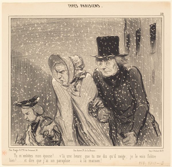Curator: What a marvelous study of character. We’re looking at a lithograph by Honoré Daumier, titled "- My God! Madame Bombec, what happened to you? - Don't mention it, my dear, it's horrible. The world is going from bad to worse, I would rather be janitor at the botanical garden! You know that Bézuchet from the fifth floor, the one that always insists that her good-for-nothing daughter who is fat around the hips has become..... I only replied: Ah, well! - And that's the person who… - Of course, even a blind man can see that!," from his "Types Parisiens" series, created around 1840. It’s held at The Art Institute of Chicago. Editor: It's like overhearing a juicier-than-average conversation between neighbors. The visual cacophony – the wild, scribbled lines – matches the frantic energy of the gossip itself! The figure bandaged like a mummy—totally caught my eye; what's her story? Curator: Ah, the perpetual injury sustained while living in society! Daumier was masterful at using caricature to dissect the Parisian bourgeoisie, revealing their petty dramas and inflated self-importance. These “types” offer insight into 19th-century social dynamics, and these lithographs made it easy to disseminate this form of criticism widely. Editor: Criticism! Right. He’s not just documenting fashion or architecture; he's building an attitude about this particular social bubble. Those frantic lines don't feel accidental; they feel charged with judgement, almost cruel. There's even something a little dreamlike to the image because those scribbles also suggest an energetic freedom of the artistic hand. Curator: His genius lies in that tension! Daumier positions us as eavesdroppers, inviting us to laugh *with* and *at* these women. The exaggeration is key. Look how the lithographic technique – with its bold lines and stark contrasts – heightens the satirical impact. Daumier's a master of making ink on paper a mirror to society's follies. He used art for his beliefs; an artwork is successful insofar as it affects what we know and feel. Editor: That phrase in the title – "I’d rather be a janitor at the botanical garden"– that's the best! He lets these tiny phrases encapsulate their whole, messy existence; almost like poetry. I have a fondness for their worldliness, no matter how cringe-worthy or seemingly trivial! I feel like I just found some new old friends. Curator: Precisely! It speaks to the enduring human need for community, however imperfect, doesn’t it? Even gossip has its place in forging social bonds, reflecting desires and values, both on a personal scale, but also for society at large. Editor: It makes me realize how little things have changed, the more things change, I guess? I have to go make some phone calls, I just got great ideas.
