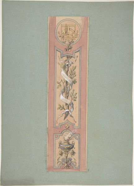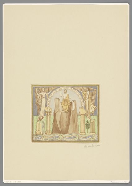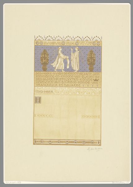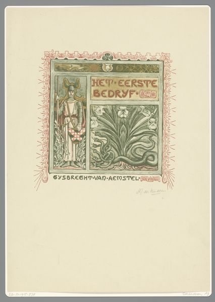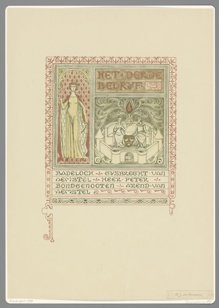 Antoon Derkinderen created this artwork, titled "Het vijfde bedryf," using a technique involving watercolour, charcoal and pencil. Derkinderen lived through a transformative period in Dutch history marked by industrialization and social change. He was deeply engaged with the cultural movements of his time. His artwork shows an engagement with themes of national identity and historical consciousness, and it reflects an interest in medieval art. The idealized figure on the left could be viewed through the lens of gender representation. Derkinderen presents a figure of ethereal beauty that aligns with the period's romanticized ideals of womanhood and the expectations that were prevalent at the time. The Amsterdam coat of arms indicates civic pride, and it reflects the increasing awareness of regional and national identities. The artist is balancing the representation of the feminine with the symbols of civic identity. This piece invites us to consider the interplay between personal identity, community, and nationhood.