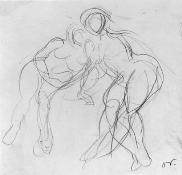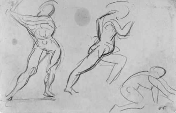 Editor: This is *Tre studier af kvindelige akrobater i en trapez* – "Three Studies of Female Acrobats on a Trapeze" by Othon Friesz, created sometime between 1906 and 1909. It’s a drawing. It has a definite academic feel with the figuration studies, but the acrobat theme introduces an exciting twist. How do you interpret this work? Curator: It's interesting to consider these studies within the context of early 20th-century entertainment and the societal view of female performers. Friesz, like many artists of his time, was drawn to the spectacle of the circus and theatre. But looking at these sketches, I'm drawn to think about labor. The acrobats, subjects of spectacle, are simultaneously laborers pushing their physical boundaries. Editor: Labor and physicality is definitely prominent! But in terms of art historical placement, Expressionism is also one of the tags and academic art as well. Curator: The tension between academic drawing and the emergent Expressionist style, evident in the distortion and dynamism, raises questions about Friesz's position in the art world. Were these quick studies preliminary works for a more ‘finished’ academic piece, or explorations pushing against traditional modes of representation? Editor: That makes me consider whether these acrobat sketches challenged the social conventions. Women pushing boundaries in the big top AND on paper. The raw materials of pencil and paper, becoming part of a visual record that’s more about lived experiences and pushing back at stuffy traditions! Curator: Precisely! This drawing, through its focus on the acrobat’s bodies and the traces of its own making, becomes a fascinating material document of its time, reflecting shifting attitudes toward labor, the body, and the very definition of art. Editor: Seeing it as a material record, a physical snapshot of evolving cultural values, that gives the work a whole new layer of meaning! Curator: Exactly. Hopefully, listeners see it the same way as well.