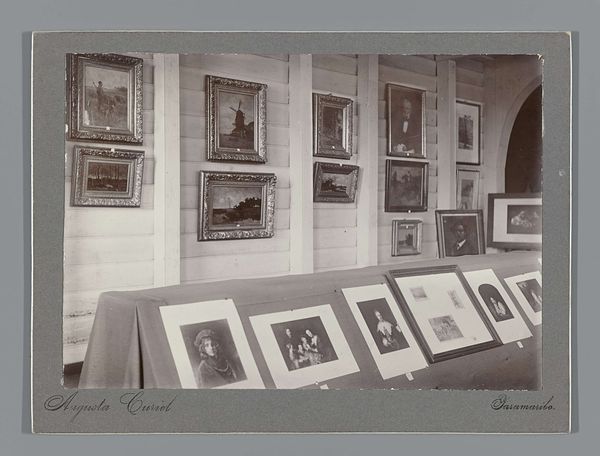 Curator: This fascinating photograph from between 1880 and 1910, titled "Exhibition of drawings and prints by Willem Molkenboer, probably in the Rijksnormaalschool voor Teekenonderwijzers," offers a glimpse into an art education setting. Editor: It’s evocative; a bit shadowy. There's an immediate sense of artistic creation and the presentation of nascent ideas. A still life captured of what seems a busy workshop, though rather silent. Curator: The materiality on display here speaks volumes. Look at the makeshift easels, the range of drawings and prints affixed in an ad-hoc display. The photo’s focus becomes the drawings hung; the photo’s quality emphasizes its own method of production rather than those displayed on the boards. The artist clearly shows the labour needed in constructing artworks from design to exhibition. It begs questions about accessibility and how work gets viewed. Editor: I find it equally interesting how those sketches and busts conjure images we’ve seen again and again over centuries of Western art. I see echoes of academic traditions in the plaster casts that crown the walls and the sketches – the ways young artists learned to translate volume, light, and shadow onto paper. The busts carry so much weight with a history of symbolic meaning. Curator: Precisely! Notice how these traditional methods were taught in what could be read as a distinctly modern framework, an early technical school that prepared students for design careers. Editor: Indeed! And even the choice to capture this space with a photograph layers meaning: it shows an institution implicitly invested in visual culture that extended far beyond just academic exercises into technology. What better way than the “snapshot” as it makes claims to freeze or to show its relation to progress. It all forms a network of intertwined artforms as an expression, a history and even an identity. Curator: Considering its placement in the Rijksmuseum today, it invites questions about our relationship to labor in creating artworks. I wonder what discussions about industrial production were being taught inside, if not shown. Editor: Exactly! The photographic lens itself creates a modern visual inheritance through its representation, doesn't it? Seeing this image lets us explore what cultural inheritance of artmaking can look like even now.