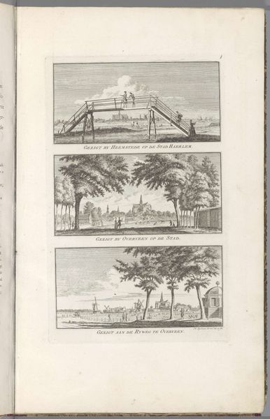 Curator: So here we have a page from Hendrik Spilman's sketchbook, "Gezichten op de stadswallen en poorten van Haarlem," dating from 1761 to 1763. Three pen-and-ink sketches on toned paper, each capturing a different view of the city. What catches your eye? Editor: An uncanny nostalgia. The windmills especially evoke a sense of time slipping, like these images are echoes from someone's pleasant, daydreamy afternoon. What are these windmills emblems of, I wonder? Curator: Windmills often symbolize progress, industry, and ingenuity – harnessing nature's power. They are potent signifiers of Dutch identity, linked to land reclamation and prosperity, even resilience. Their enduring presence, even now, signifies a connection to this past. But Spilman's images... They’re interesting because he combines these symbols of Dutch strength with quite ordinary, unassuming scenes. Editor: It’s a comforting paradox, this marriage of monumental identity with simple daily life. It tells a story about pride, surely, and practicality, too. He depicts them alongside folks on bridges and by buildings. Do you suppose there are subliminal allegories being suggested? I'm wondering about trade, maybe, given Haarlem's history. Curator: Perhaps, but I think it is possible he was simply capturing the environment around him, observing how the daily commerce intersects with these historical landmarks. It isn’t only trade or one specific activity; these structures were vital to every facet of early Haarlem life, to everyone who moved within its borders. I don’t think Spilman needs allegory when these buildings speak so eloquently on their own. Editor: So you're drawn to their architectural, almost topographical, presence. While I lean toward interpreting the windmills as symbols interwoven with daily activities, their very existence creates a shared identity that extends through time. But even if we disagree on this point, Spilman’s sketches have transported me to this distant place. Curator: Indeed, they’re an invitation to consider the narratives woven into landscapes.