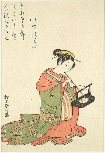 Curator: This print by Utagawa Kuniyoshi depicts a geisha playing a musical instrument, part of a series representing women from the Suikoden. What strikes you about this work? Editor: I’m intrigued by the juxtaposition of the geisha with the inset image, almost like a painting within a painting. How does this layering contribute to our understanding? Curator: It prompts us to consider the roles and representations of women in 19th-century Japan. The geisha's artistic expression is framed, perhaps critiquing or celebrating the constraints and performances inherent in her position within society. Editor: So, it's not just a portrait but a commentary on social dynamics? Curator: Exactly. Kuniyoshi is subtly engaging with the complex realities of gender, class, and artistic expression within the context of the Suikoden narratives. What did you think? Editor: I never considered the social critique inherent in the print, that’s very interesting. Thanks!