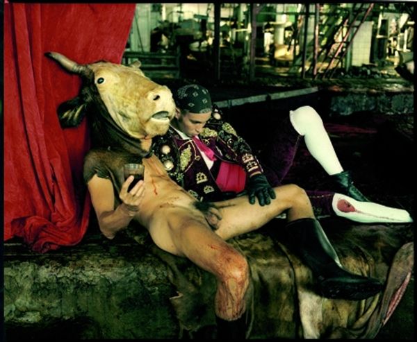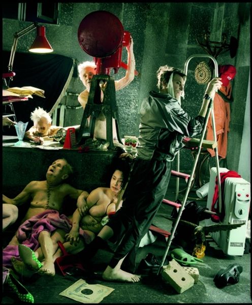 Curator: My immediate impression is... unsettling, to say the least. A very still, almost tableau-like composition with the figures all so very...still, but charged with an undeniable tension. Editor: Indeed. What you're observing is Arsen Savadov’s C-print, “Book of the Dead,” created in 2001. Savadov, a Ukrainian artist, works across media but is particularly known for these staged photographic scenes which directly allude to neo-expressionist styles prevalent at the time. Curator: Staged is right. The lighting, the arrangement of the figures...it feels theatrical. There’s something deeply unsettling about these seemingly post-operative bodies intermixed with such childish objects as that pink toy car, almost like some grim satire of...what exactly, I'm not sure. Editor: Precisely! Savadov masterfully plays with that tension. Looking through the lens of art history, the work sparks many discussions about the role of the body in art and how nudity, traditionally used to glorify the figure, is here charged with a new and violent sensibility. What political or societal forces could lead to its decay? Curator: That violent sensibility is spot on. There's a visceral quality, even in a photograph. All those scarred torsos… the pallid skin. What does that mean to use photography to capture something almost traditionally "painterly"? Almost like you have a scene emerging right out of Bacon, you know? Francis Bacon! Editor: An interesting reflection indeed! His decision to use staged photography pushes our perceptions around reality versus performance. The "Book of the Dead" suggests not only the decay of individuals, but also societal or even ideological corruption, if we position its figures and symbolic elements properly within the framework of the social history and turbulent politics in post-Soviet Ukraine. Curator: Ideological corruption. Absolutely. That would add a very personal element, and it gives this entire "stage" a more intimate angle of seeing bodies as records or pages from some unseen, perhaps, unwelcome future… Like the old days of religious art, warning you from being bad! In a new avant garde setting...it almost tickles me. Editor: Exactly! It's almost too much, but that excess generates the question—how have societal factors conditioned such potent imagery? What unspoken expectations of art does "Book of the Dead" openly subvert? Curator: I guess, on closer examination, Savadov pulls us into that tension on purpose, prompting a dialogue with the art and a quiet questioning to us as its observers. Editor: Indeed, an encounter that challenges expectations on various social and aesthetic levels, proving that in many ways it goes beyond the purely personal.
