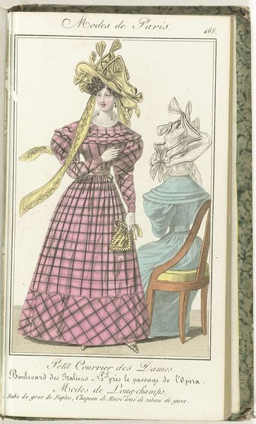 This fashion plate, made in 1827, likely involves a combination of etching and engraving, with hand-applied color. A print like this wasn't just about showing off the latest styles. It was an early form of mass media, feeding a growing consumer culture. The labor involved is subtle but significant. The engraver meticulously etched the lines, the printers produced many copies, and then someone, or several someones, had to apply the delicate colors by hand. Think of it as a proto-assembly line for taste, creating desire for fabrics, trims, and the skilled labor of dressmakers. The depicted dress with its striped pattern, frills, and puffed sleeves, speaks to the burgeoning textile industry. The straw hat trimmed with lace and feathers also suggests a whole network of specialized craftspeople. These details weren't just aesthetic choices, they were signs of economic power, and the globalized production of fashion. Fashion plates like this blurred the lines between art, craft, and commerce, revealing the intricate dance between labor, materials, and the making of modern desire.