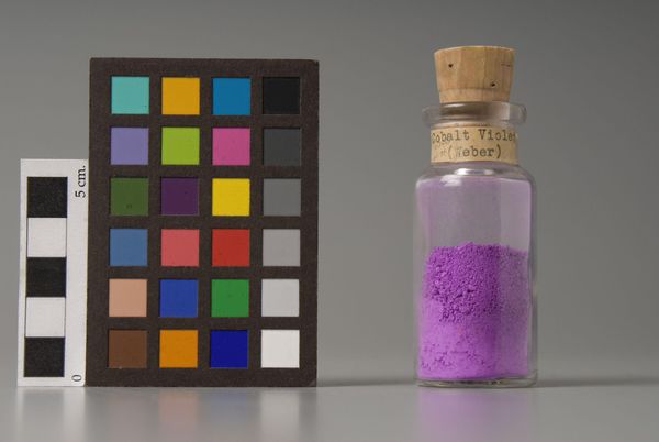 Curator: I'm immediately struck by the almost clinical coolness of the composition, despite that vibrant magenta hue of the pigment. Editor: This is “Cerise Toner (Rhodamine),” manufactured by the Imperial Paper & Color Corp. Part of the appeal lies in its matter-of-fact presentation, next to a color chart. It becomes an exercise in observing how color standards are maintained. Curator: Right. The color chart provides a framework, making the bottled pigment less a mysterious substance and more of a regulated industrial element in circulation. But color carries cultural associations. Rhodamine, derived from roses, evokes complex emotions. Editor: Indeed. The "Imperial" name and the almost bureaucratic label hint at the larger social and economic structures that control the production and distribution of color—and, by extension, influence our perceptions. Curator: It really does make you consider the psychology of color, doesn't it? How color affects us and is also dictated to us. Editor: Precisely. It's a fascinating object that reveals the intersection of art, industry, and social control.