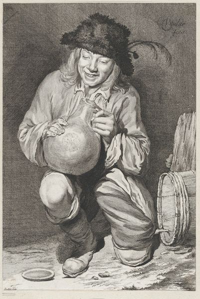 Isaak Bager made this undated etching, "Ein trinkender und ein schlafender Savoyardenknabe," which translates to “A drinking and a sleeping Savoyard boy.” This artwork is more than just a charming scene; it’s a social document, a commentary on the lives of itinerant child laborers. Savoyards, from the region of Savoy in the Alps, were often sent away as children to work as chimney sweeps or street performers. Bager’s choice of subject matter reflects a growing awareness, in the late 18th century, of social inequalities and the exploitation of the poor. The contrast between the lively, drinking boy and his exhausted companion speaks volumes about the harsh realities of their existence. It subtly critiques the social structures that allowed such conditions to persist. To understand this image fully, we can delve into period documents about child labor, travel writing on the Savoyard region, and studies of street culture. We discover the meanings of art are always rooted in real-world conditions.