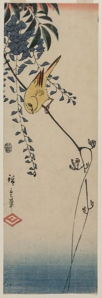 Curator: Let’s spend a few moments with Utagawa Hiroshige’s “Kingfisher and Iris,” a woodblock print created around the 1830s. The piece now resides here at the Minneapolis Institute of Art. My first thought on seeing it: so refreshing, a little slice of calm! Editor: Absolutely! There’s something inherently peaceful about it. But that kingfisher diving, spear-like, throws in an element of intense action, doesn’t it? A predator in pursuit. What do those contrasting feelings evoke for you? Curator: Well, the iris are almost heraldic, these dignified emblems emerging from a misty wash of blue – it’s all surface tension. The kingfisher just shatters that elegant surface; the intrusion of pure life-force into a stylized world. Editor: Exactly! And Hiroshige’s work is fascinating for its integration of traditional symbols with these fleeting moments of observed reality. The iris itself, known as *kakitsubata* in Japan, represents purification and protection… juxtaposed against that raw instinct for survival embodied in the kingfisher. A dance between stillness and frenetic energy. Curator: I agree completely! The kingfisher is almost painfully bright in its detail, especially contrasted with the cool blue irises and the muted background. It’s as if he’s demanding our attention, demanding to be seen as alive and urgent. I feel drawn to the idea of "floating world"– or ukiyo-e, transient, and existing right now. What is more transient than a fleeting moment of capture? Editor: I feel this piece deeply emphasizes our intrinsic link to the natural world. In traditional Japanese symbolism, birds often carry messages from the divine, or act as intermediaries between worlds. The iris is also a symbol of male children as well, which gives another layer of life into this single image. Curator: Interesting! In this artwork it makes sense because the Iris, although standing powerfully in the space, is no match to the Kingfisher which is also full of meaning. Editor: Precisely, It offers an insight on an encounter; ephemeral, like an insight between human, nature, and time. Curator: Looking closer, both delicate, the work overall encapsulates and is more about this harmony and our mutual belonging, which now, as always is such an enduring theme. Editor: Indeed. A single moment made timeless.