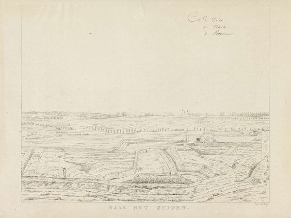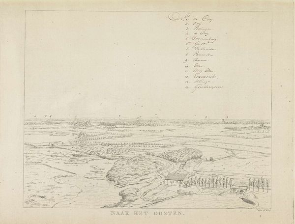 Editor: Here we have Derk Anthony van de Wart's pencil drawing, "Gezicht op het landschap ten zuidoosten van Nijmegen," dating from between 1815 and 1824. It’s a wonderfully detailed landscape, but also feels… controlled, almost surveyed. What do you see in this piece, especially considering the socio-political context of the time? Curator: I see a landscape pregnant with power dynamics. The artist meticulously charts the land, enacting a kind of visual possession. Think about it: the early 19th century was a period of intense nation-building across Europe after the Napoleonic wars. Who owned this land, and who benefitted from its representation in this way? Editor: That's interesting. I hadn't thought about it in terms of ownership. It just seemed like a pretty picture, to be honest. Curator: But even pretty pictures serve ideological functions! The neoclassical style itself speaks to a desire for order and control. Van de Wart is not just depicting nature; he’s imposing a framework onto it, almost a visual inventory. What does the sharp definition suggest to you? How might that connect to the idea of claiming a territory, of reinforcing societal hierarchy and national identity? Editor: So you're saying this drawing is a form of claiming, marking territory? Curator: Precisely. Consider also how such depictions could shape perceptions of the land itself, encouraging certain uses over others, and implicitly excluding those who don't fit into that vision. How do you think the rising bourgeois class in the Netherlands at the time would view such a carefully rendered landscape? Editor: It makes me rethink how even seemingly objective landscapes can carry hidden meanings about power and control. Thank you, I'll definitely look at landscape art differently from now on. Curator: And I have come to appreciate the power that "pretty" images hold in shaping collective desires!