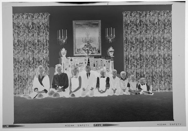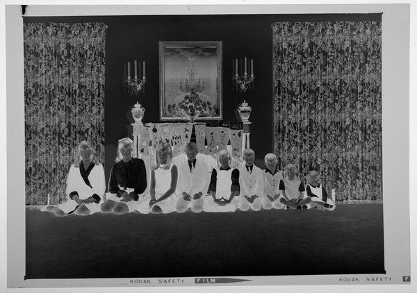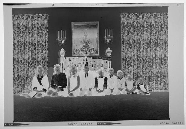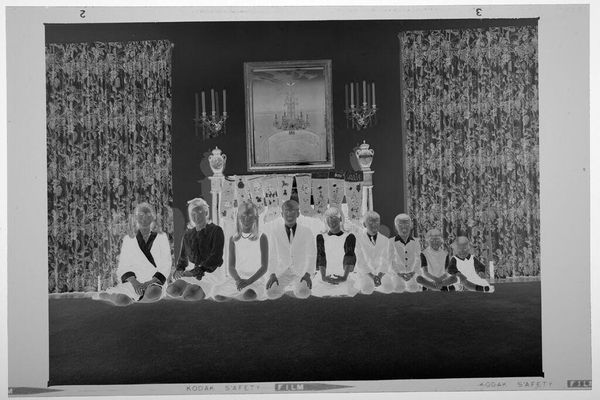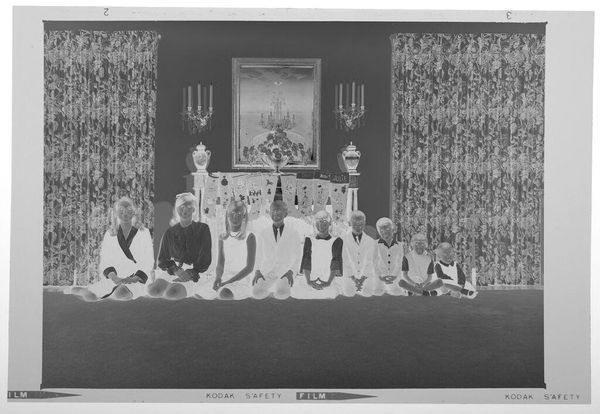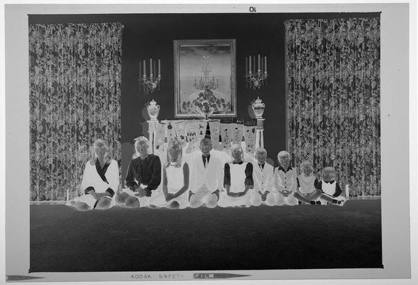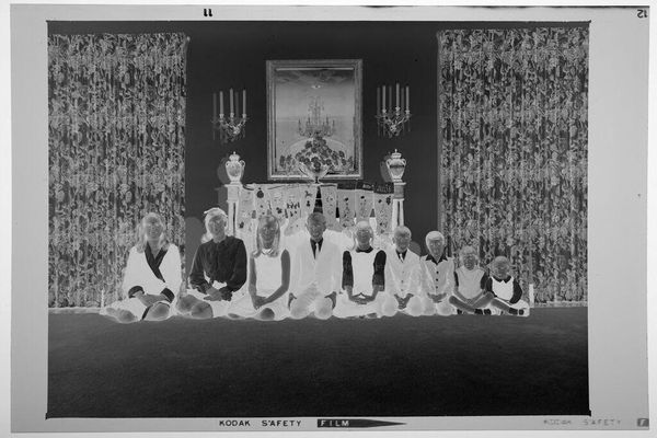 Editor: This gelatin silver print by Martin Schweig shows nine children posed in front of a fireplace. It feels very staged, almost like a play. What can you tell me about the context in which it was made? Curator: It’s interesting to consider how photography, especially portraits, operated in the mid-20th century. Families wanted to project a certain image – what societal expectations were at play here? Editor: Perhaps the desire for an idealized family portrait drove the formality? Curator: Precisely. Think about the social pressures on families during this period. The image becomes a carefully constructed performance for the camera and, ultimately, for public consumption. Editor: So, it's less about capturing reality and more about reinforcing a specific social narrative. I never thought about family photos that way. Curator: Indeed. This piece makes us question the truth-value of photography and its role in shaping perceptions of family life.