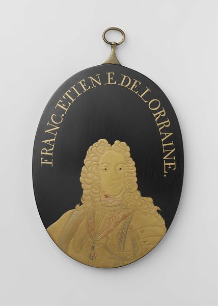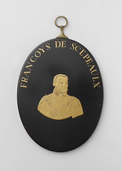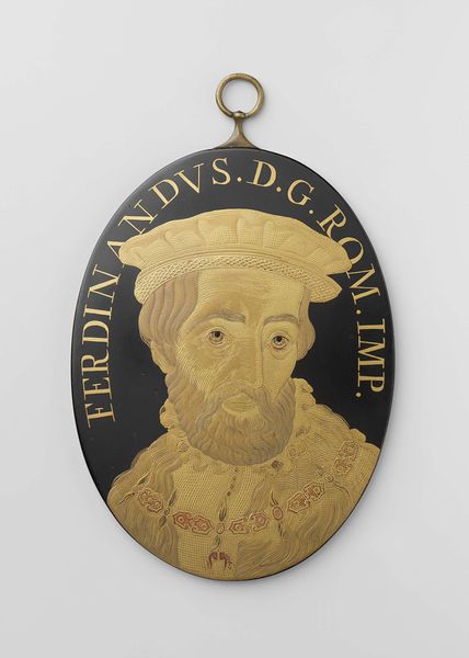 This is an anonymous portrait of King Henry II, made with an unknown medium, and housed here at the Rijksmuseum. The portrait's striking contrast immediately commands attention: a dark, polished ground against which the golden figure of the king emerges. The artist has masterfully used the oval shape to frame the monarch, with the inscription "REX. HENRICVS" arching above, literally crowning the portrait. Observe the texture achieved through delicate lines, especially in the king’s hair and beard, giving depth and vitality to the golden surface. This precise detail lends a tactile quality to the image, almost as if the king’s presence could be felt through touch. The cross and crown, symbols of Henry’s power, are not merely decorative; they act as signs that anchor his identity within a structured visual language of royalty and authority. The contrast creates a tension between visibility and concealment, inviting you to consider how identity is constructed and communicated through symbols and aesthetic choices.
