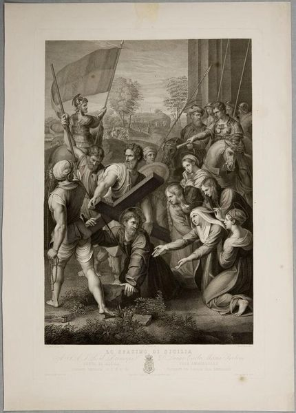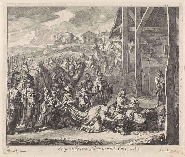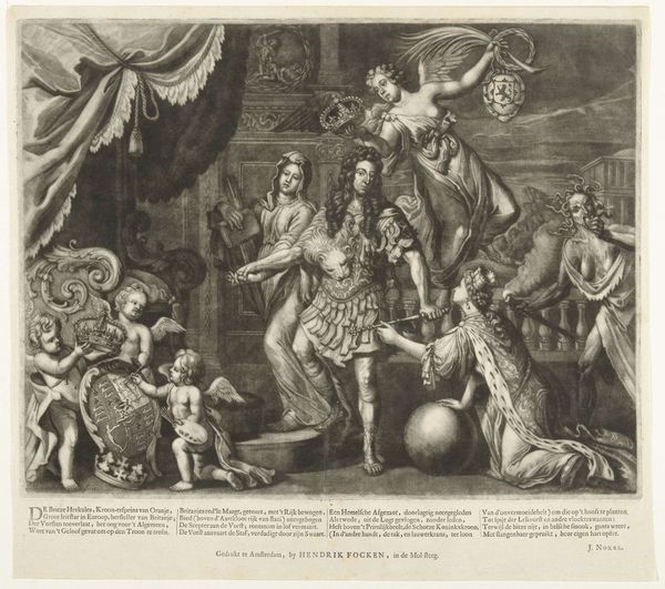 Curator: Edelinck’s engraving, "La Modération est une Seconde Victoire", presents a staged encounter, highlighting textures through varied line work. Note the difference between the drapes and armor. Editor: The scene feels almost theatrical, doesn't it? Like a paused moment in a play, the dramatic lighting accentuating the tension. Curator: Indeed, the printmaking process allows for mass distribution, translating elite narratives into consumable images for a wider audience, impacting social values. Editor: It reminds me of stories of moral restraint—the kind that linger in your mind long after you've heard them. Curator: Exactly. Edelinck uses burin techniques to meticulously depict fabrics, armor, and emotional responses, revealing the social context and artistic skill valued at the time. Editor: The faces are really captivating. You can see so much in those expressions. Maybe moderation really is a second victory.
