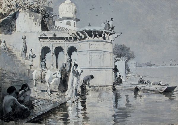 Curator: Here we have Edwin Lord Weeks' "Along the Ghats, Mathura," dating back to around 1880. An oil painting depicting everyday life in India. What are your first impressions? Editor: It's quite striking. The warm, sun-drenched palette really brings out the textures – the stone architecture, the fabrics, even the water itself. It all feels so tangible. Curator: Weeks was part of the Orientalist movement, and paintings like this played a key role in shaping Western perceptions of the East. The public's fascination with exotic locales fueled a market for these depictions. Editor: Precisely! And that brings to mind the means of production here. He obviously had the financial backing to travel, acquire materials, and spend the time required to create this level of detail. The labor involved – from pigment creation to the canvas preparation – it’s a network. Curator: Certainly, there's a power dynamic embedded in this gaze. Weeks, an American artist, is presenting his version of Indian life to a Western audience. His style, rooted in Realism, lends a sense of authenticity, even though it's still a constructed reality. Editor: I see what you mean, but look closer at the way the ghats are painted. The individual brushstrokes, the layered application of oils, creates a richness you wouldn't find in a mere documentary photograph. He’s emphasizing the built environment and how human labor has formed that riverfront. Curator: And consider the composition, too. The ghats act as a stage for these daily activities, from bathing to transportation, but they're activities often simplified and presented through a western lens of romanticism and adventure. Editor: I agree; the subject is very busy. From the figures leading the cattle to the boats unloading goods along the bank – but they were not constructed in a bubble! Think of all the anonymous artisans that went into creating these materials and goods that we're glimpsing. Curator: Absolutely. This artwork serves as a window into a specific historical moment, showcasing how art and culture became intertwined with colonial narratives. Editor: And it encourages me to examine not just what's represented but how it was made, consumed, and then integrated into the cultural landscape of both East and West. A beautiful demonstration of interconnected creative economies across different material forms and the labor required for those networks.