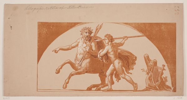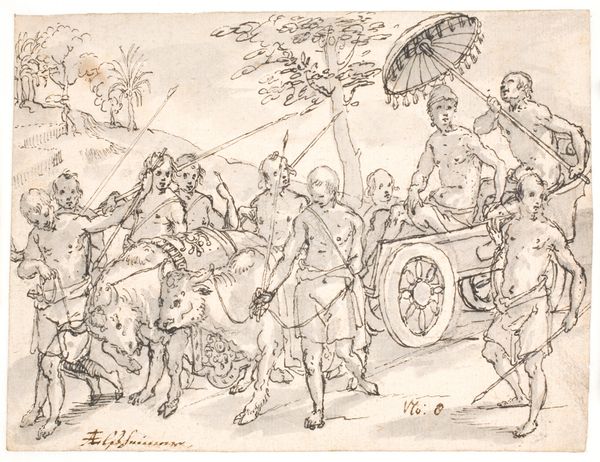 Nicolai Abildgaard made this drawing, "Pax trimphans," using pen and brown ink on paper. It’s a classical scene, rendered with quick, assured strokes. The thinness of the lines gives the whole composition a fleet, dynamic quality. You can almost feel the movement of the chariot, the wind in the figures’ drapery. Abildgaard’s technique, with its emphasis on confident lines, reflects a trained hand. We can see the influence of academic drawing practices, where mastery of line was considered fundamental. While the subject is high-minded, a celebration of peace, the drawing’s materiality hints at the labor and skill involved in its creation. The ink, likely mixed by hand, and the paper, carefully chosen for its texture and ability to receive the artist’s marks, speaks volumes about the value placed on craft and artistic expertise in Abildgaard’s time. In the end, it is the relationship between the artist’s skill, the chosen materials, and the historical context that truly brings this artwork to life.