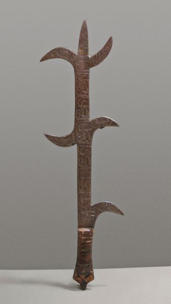 Editor: So, this is a rapier, dating roughly from 1585 to 1645. It’s currently housed in the Metropolitan Museum of Art. Made from metal, it feels unexpectedly delicate given what it is... How do you interpret this work, looking beyond its basic function as a weapon? Curator: It whispers tales of courtly duels and Renaissance swagger! Far from just a weapon, the rapier was a potent symbol of status, almost jewelry for gentlemen. What catches your eye first? The intricate design work? I mean, somebody really loved decorative arts. Editor: Absolutely! The detail is astounding, it’s more like sculpture than a blade, doesn't it remind you of 'decorative-art'? The geometric forms and tiny figures adorning the hilt. It's hard to imagine someone actually using it for fighting. Curator: Right? Imagine going to war with this ornate rapier. So the decorative aspect of weapon making during this era, transcended pure utility to make them art objects and a means of social messaging. The "bling," I think they now call it. The sword would really do the talking... Does that shift how you view it now? Editor: It does, yeah! Seeing it as an extension of identity and social display definitely opens up a new perspective. A dangerous fashion statement, then. Curator: Precisely! It’s about projecting power and prestige as much as it is about personal defense. Next time you see metal work this old, remember you are dealing with ancient messaging devices and people making ancient moves... It is also amazing to me, someone who spent a whole lot of time figuring out "where to be"... How something like this winds up on display at the MET and gets written about in art history books... It’s fate! Editor: This reframes my thinking entirely. I initially saw just a historical weapon. But now, I'm also seeing a statement of identity frozen in metal, I'm impressed with decorative-art! Curator: Exactly. Isn't it amazing how much a single object can tell us?