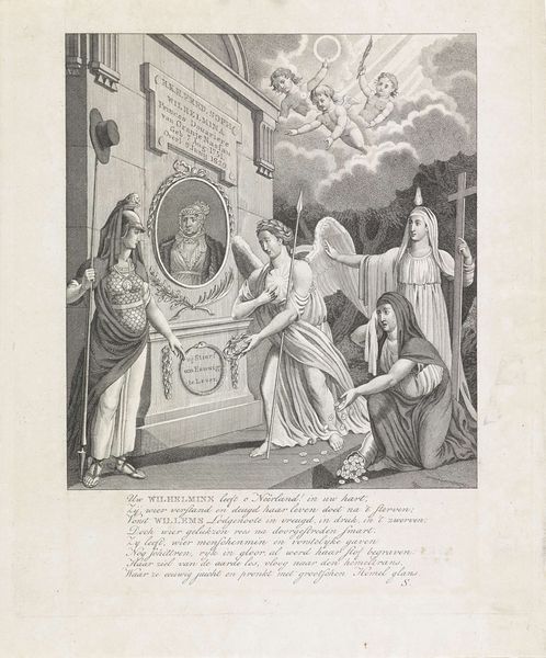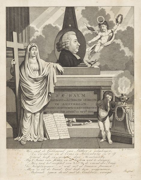 This print, made by Jan Gerritsz. Visser, presents a memorial to George Hendrik Laghers. Dominating the scene is the allegorical figure of Faith, identified by the flame above her head. She rests her hand upon the Gospels, signifying divine truth. Notice how the image consciously intertwines earthly and divine symbols. The winged angel and cherubic figures, classical motifs evoking divine protection, flank the portrait of Laghers. These motifs find echoes in earlier Renaissance art, where angels are frequent symbols of divine messengers and protectors. Consider the cyclical nature of such symbols. The motif of Faith, with its roots in classical virtue, reappears throughout history, constantly adapting. The angel's gesture, the open book: all these are encoded with layers of cultural memory, resurfacing, evolved, to convey reverence. The image resonates with the subconscious echoes of similar depictions across time. It’s a testament to the enduring power of symbols.