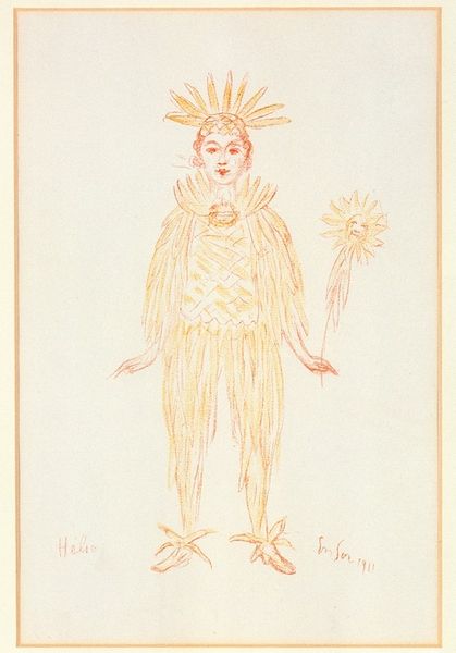 Editor: Oh, my goodness, talk about light on its feet! This almost feels like a memory floating off the page. So ethereal and... flowery? Curator: Indeed! What we're looking at here is "Corylopsis," a watercolor and pencil work by James Ensor, dating back to 1929. The Corylopsis is a flowering shrub, native to Asia. It appears this piece may be a costume design for a theatre or ballet production. Editor: Ah, that explains it! I see that theatricality. There's something almost playful in the presentation, like a fairy-tale character dreamt up in pastels. The way the colors bleed slightly makes it all the more dreamlike, right? But I'm curious, where does this sit within Ensor's wider body of work? It's not what I immediately associate with him. Curator: That's an astute observation. Ensor is best known for his paintings featuring grotesque masks and crowded scenes satirizing bourgeois society. However, he designed numerous costumes, primarily for performances at the Theatre Royal de la Monnaie in Brussels. "Corylopsis," therefore, reveals another facet of his creativity – his engagement with design and performative culture. Editor: I like that—it reveals how playful and experimental artists can be. I’m also curious, who decides to archive, preserve and exhibit art, and what agendas they carry. Do these curators reflect their socio-cultural values and class backgrounds? This guy or gal Corylopsis looks innocent. Did it escape all those filters of what to value, and get an audience almost 100 years later? Is Corylopsis the great leveler? Curator: Well, I hope Corylopsis finds its audience as much for the technique and talent Ensor displays here, as much as Corylopsis' apparent democratic effect. Thank you for sharing your perspective, your comments always add a little sparkle to things! Editor: Likewise! That insight was very illuminating, indeed.