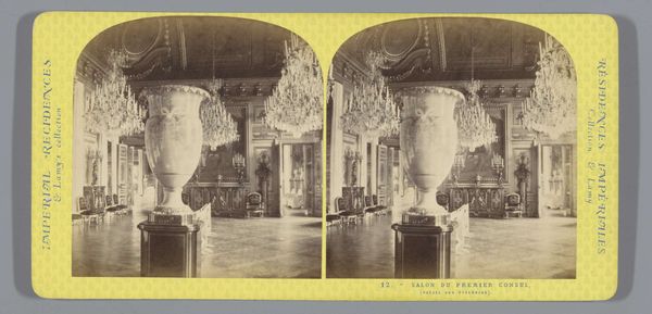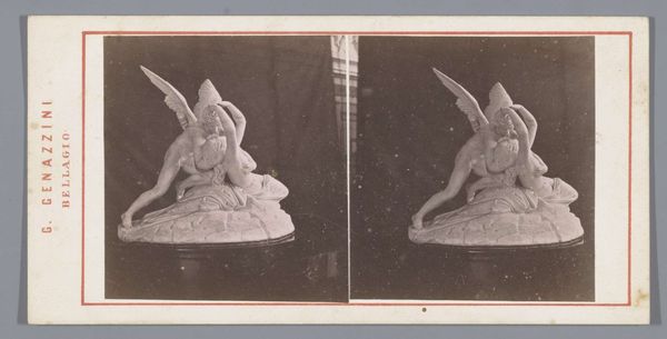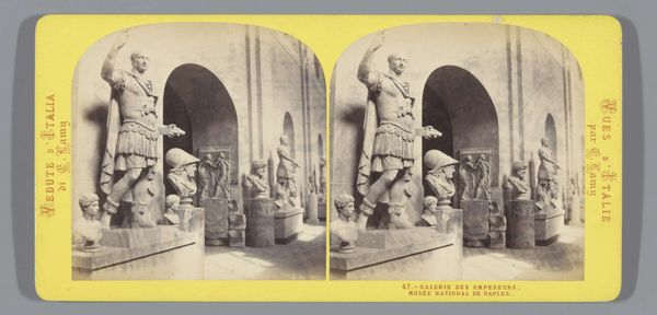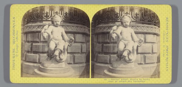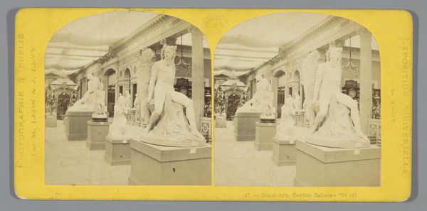 Curator: This stereoscopic image presents a bronze sculpture, dating roughly between 1860 and 1880, depicting a faun carrying a kid. It was captured by Ernest Eléonor Pierre Lamy. Editor: My first thought? It's got a poignant, slightly burdened feeling. The strong faun, yes, but also that weight...the little goat seems more of a responsibility than a trophy. It almost has me wondering about that relationship. Curator: Lamy's photographic work gives insight to the sculpture itself, but consider too the labor of the bronze casting itself. Think of the foundries, the workshops, the economies supporting the creation and display of such pieces. It's industrial as well as artistic, showing social status. Editor: Absolutely, that contextual layering is essential. I do see how bronze in itself connotes wealth and power and that definitely informs the photo’s context within this opulent hall of mirrors in Grand Trianon! And looking at it from the viewpoint of photography as an emerging industry itself around that time? Layers, layers. I find myself empathizing a bit more with the faun – or rather, what he *represents* in this carefully constructed display of mastery. Curator: Right! These period photographs are objects too. Consider that gelatin-silver prints involved significant industrial production in photographic chemistry. Even a photograph signifies economic output as well as taste. It’s about more than classical themes. Editor: Which then comes around again to the sculpture's inherent classical roots, doesn’t it? How it connects or perhaps disguises the shifts in artistic output, cultural values with something recognizable – it’s a fascinating dance between ancient myth and modern industry. And perhaps that perceived weight is simply how these things coalesce at one point in time… or perhaps my mood this morning, I won’t deny! Curator: Precisely. It's that meeting point – between production and representation – which interests me. Editor: I concur, seeing those tension is what keeps art compelling. The eye finds the detail of course, but the mind creates narrative by understanding *why*.