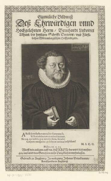 Cornelis Nicolaus Schurtz created this portrait of Johannes Stumpf using engraving techniques. The portrait is dominated by the subject's face, framed within a meticulously inscribed oval border. The texture, achieved through fine lines and hatching, creates subtle gradations of light and shadow. This adds depth to Stumpf's features and the intricate ruff around his neck. The use of line in this piece is particularly striking. Note the way parallel lines create tonal variation, giving volume to the figure. The oval form containing the portrait disrupts any sense of linear perspective, creating a self-contained world. This formal structure is echoed in the symmetry of the inscribed text below, where the balance of words mirrors the visual stability of the portrait. The careful arrangement of textual and figural elements invites us to consider how meaning is constructed not just through representation but through the very structure of the artwork itself. This isn't merely a likeness; it’s a carefully constructed statement about identity, status and legacy.