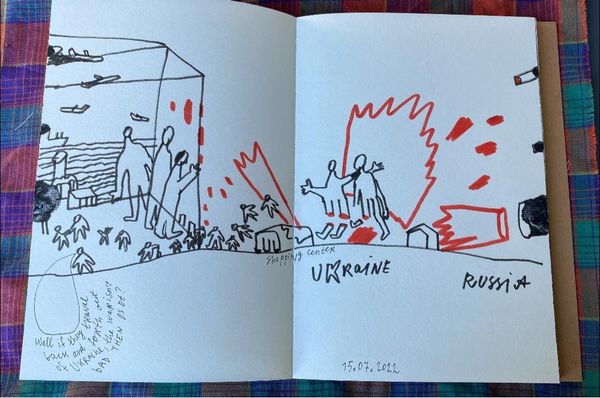 Curator: What a stark image, isn’t it? We are looking at a drawing from 2022 by Alevtyna Kakhidze, simply titled "Untitled." It's ink on paper. Editor: Yes, immediately my eyes are drawn to the stick figures. Their open arms, like they are awaiting something, or perhaps surrendering, but there's also a vacant look. There's a disquieting fragility in their simplicity, isn’t there? Curator: Absolutely. The crudeness of the figures juxtaposed with the very real, visceral impact of the implied violence… the buildings like little boxes are burning in the scene. It reminds me a bit of Social Realism, in its unflinching gaze at the realities of society. Editor: The burning buildings really puncture the idyll, don't they? Those smoking, charred symbols evoke memories of destruction we've seen across news and history, particularly related to places enduring immense hardship, such as Ukraine. Curator: Precisely. Kakhidze uses stark imagery: are they bombs, or meteorites? And there's that handwritten text, which makes the piece deeply personal, it states in English "Ukrainians who are just left in homes", with “Russian roulette” written in Russian below. Editor: It's potent, that jumble of languages. Using “Russian roulette”, you get this awful collision of cultures, of power, and fatalism, while the houses offer a primal symbol, resonating through cultural memory, reminding us that “home” represents safety and heritage, now cruelly threatened. Curator: The whole composition reads like a modern-day memento mori; an appeal against the temporality and devastation of conflict. It uses childish drawings, contrasting starkly with the grown-up concept. Editor: It’s raw vulnerability on display. It feels important to acknowledge that unease. The drawing reminds us how vital visual narratives are in confronting and processing collective traumas and understanding our present moment. Curator: It's almost a protest, shouted from the rooftop using just a bit of ink and paper, and it captures so much of the truth that is the reality now. It will certainly stick with you long after you leave. Editor: Absolutely. Its simplicity allows direct communication of such an emotion that speaks of an entire geopolitical situation. We feel that stark naked exposure; nothing masks that deep vulnerability and those exposed realities.
