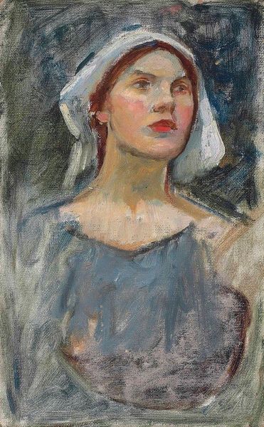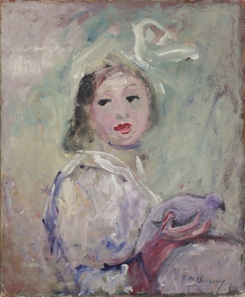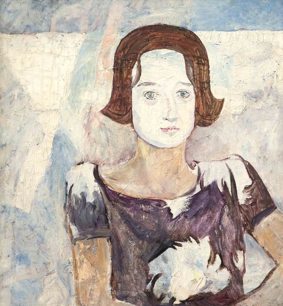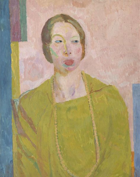 Editor: This is Arthur Beecher Carles' "Portrait of Katharine Rhoades," painted in 1912 with oil on canvas. It has such a subdued, almost ghostly quality, with the soft blending of colors. What do you see in this piece beyond the surface representation? Curator: The ghostly quality you mentioned resonates deeply. Notice how Carles renders Rhoades' face, almost masking her emotions. It’s not just a likeness; it’s an exploration of interiority, filtered through the lens of modernist aesthetics. Her averted gaze evokes the Symbolist tradition where women often represented the unknowable. Editor: The lack of clear emotion is striking. Do you think the average viewer at the time would have understood or appreciated this approach to portraiture? Curator: That’s a vital question. Traditional portraiture aimed to capture social standing and character. Carles subverts this. He replaces external markers with a focus on the psychological state. This abstraction distances the sitter. Instead of being a known quantity, she becomes an emblem, representing the fragmented self in a rapidly changing world. Note also how he mutes traditional colouration to create this sense of displacement. Editor: So, rather than a specific individual, she embodies a more universal experience? Curator: Precisely. And it invites us to consider the symbolic weight of this era - a society questioning established norms, leading to introspection, even alienation, reflected in this subtly unsettling, beautiful image. Does it remind you of any similar themes across different historical periods? Editor: That’s a perspective I hadn’t fully considered. It encourages a far deeper reading of the image than I first anticipated! Curator: Indeed, seeing portraits as visual emblems can completely change the way we experience and interpret them.