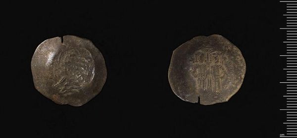 Curator: This is a coin of Alexios III, currently held in the Harvard Art Museums. Editor: It looks like something you might find buried in your backyard; the kind of thing that whispers secrets of forgotten empires! Curator: Absolutely. These coins served not only as currency, but also as powerful symbols of imperial authority. Examining the iconography, we can unpack the complex social and political structures of the Byzantine Empire. Editor: It also looks incredibly tactile. I want to feel the weight of it, imagine the hands it passed through, what transactions it facilitated. It's like holding a piece of history in your palm, you know? Curator: Exactly! And how these objects circulated reveals trade networks, political alliances, even the everyday lives of people long gone. Editor: It makes you wonder about the stories it could tell, if it could talk. Curator: Indeed; and through historical analysis, we can give it a voice, one that speaks to power, belief, and exchange. Editor: Yeah, it’s a little portal to another time, isn’t it? Curator: Precisely, revealing intricate systems of meaning and influence. Editor: I love that; I'm definitely seeing it with fresh eyes now.