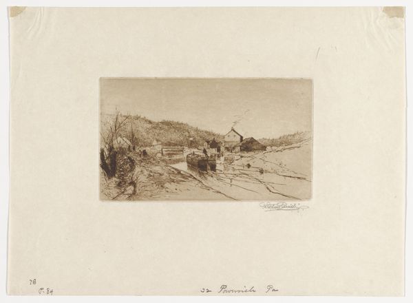 Editor: This is "Oevers van de Amblève bij Targnon," a landscape print made by Jean Pierre François Lamorinière sometime between 1838 and 1888. It’s an etching, which gives it a very detailed, almost delicate look. It has a quiet mood, don't you think? I’m curious, what do you see in this piece, focusing on its materiality and production? Curator: Beyond the image, I see a convergence of labor, material, and societal values. Think about it: copper, acid, paper – all extracted, processed, and refined through labor. The artist then manipulates these materials through skill and labor to produce this image. Editor: That’s fascinating. So you’re saying the image itself is less important than understanding how it came into being? Curator: Precisely. How does the process of etching, with its acid baths and the repetitive act of mark-making, affect our understanding of landscape? Consider too, the social context. Prints were a popular medium for mass dissemination. Was Lamorinière attempting to democratize access to the Belgian landscape, or was he simply participating in the burgeoning market for picturesque scenes? What materials were used, where were they sourced, and what labor went into it all? Editor: That brings up so many questions about accessibility and consumerism! Was he responding to an urban audience desiring images of nature? Curator: Exactly! It's important to acknowledge the social meaning imbedded into the art object. It pushes us to consider what such depictions of rivers may say about industrial needs and use, even abuse, of land in that period. Editor: Wow, I never considered all the layers of material and labor involved. I now see how analyzing its production helps us really understand the artist and this moment in time. Curator: Indeed, it opens new avenues for interpreting artistic expression and its social impact.