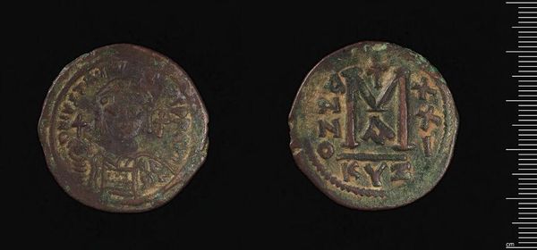 Curator: Here we have a fascinating artifact: a coin issued by Tiberius II. It's a small thing, but holds immense symbolic weight. Editor: The material is clearly weathered, yet the details remain remarkably crisp, particularly the figural representation. There’s a clear hierarchical structure within the composition. Curator: Indeed. This coin likely served as a medium to communicate the emperor's authority, not just economic power. Consider the iconography of power at play here. Editor: The coin presents two faces. One appears to be the emperor, the other, several figures in an architectural setting. Both employ deliberate patterns, guiding the eye. Curator: Precisely. It acts as a cultural memory. What narratives did these symbols evoke? What continuities and changes did they represent? Editor: The artistry lies in achieving such legibility and symbolic density within a limited space. It really makes you think about value and form. Curator: It gives us much to reflect on, doesn't it? A tiny object, a massive history. Editor: Absolutely. A microcosm of power, preserved through form and time.