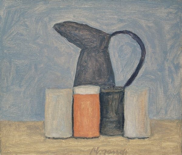 Curator: So this is a still life, “Natura Morta”, and although it’s undated we attribute it to Giorgio Morandi. It's an oil painting. Editor: Mmm, I feel this quietness, a sort of muted contemplation. The objects seem like they're holding their breath. Almost a hum. Do you feel that? Curator: Absolutely. Morandi was deeply engaged with Italian Renaissance traditions, yet he pursued such a radically reductive approach. His interest lay in the shapes and how light reveals form. He arranged common vessels, bottles, boxes on a tabletop in his Bologna studio, returning to them day after day. Editor: And look how subtly he manipulates color – these near-neutrals become incredibly rich through texture and slight shifts in tone. Those bands of blue and white are like tiny rebellions against the beige, aren't they? Almost musical. The arrangement and rendering are more dreamlike, less concrete. The work is also about repetition, isn't it? Curator: Yes, repetition was key. The bottles almost become stand-ins. I see that quiet, humble meditation also as something about interwar Italy. The regime looked for displays of virility and grand statements, and here comes Morandi focused just on the poetics of common objects. Editor: So, a subversive act of domestic intimacy and attention, through form and a specific mode of composition, in response to the dominant voices? Curator: Exactly. He subverts grandeur by exploring simplicity. There are always dialogues within a greater history. Editor: This simple assemblage of forms offers more than just their appearance. This hum evokes that push and pull... Thank you, Giorgio.