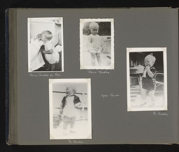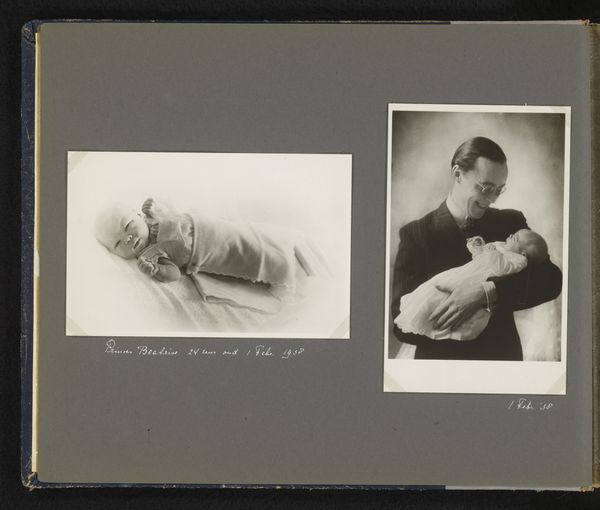Curator: Here we have "Prinses Beatrix", a gelatin-silver print dating to 1938, found within the Rijksmuseum's collection. It is comprised of mounted photographs in what looks like an album. Editor: Well, it's intimate, isn't it? Those tiny, vulnerable portraits interspersed around what appears to be a family gathering. I immediately feel a sense of curated memory. Curator: The composition does suggest a deliberate arrangement. We have, centrally, a larger image, with others set to its right. Formally, this larger photograph employs strong contrast, especially noticeable on the figures clustered together. Editor: Exactly. Notice how Beatrix, though an infant, is already the focal point—literally bathed in light, coddled in their arms. Her innocence, captured at a vulnerable stage, projects onto the cultural memory of Dutch royalty. Curator: While that’s quite perceptive, the photographer does draw attention to textures as well. The interplay between the patterned wallpaper in the large image versus the sleek flat album background contrasts sharply with the softer, fabric texture swaddling the infant. It draws your eye between different image planes, creating visual depth and dynamism, given this is just a simple black-and-white photo. Editor: Absolutely. But also observe the psychological element: each family member appears to gaze protectively towards the baby, reinforcing the cultural significance of lineage and the inherited role she carries as a future queen. The individual baby portraits arranged beside the family unit seem to underscore moments of observation or inspection of that role. Curator: From an arrangement standpoint, the positioning does offer differing modes of visual inspection. Notice how one framed photograph is a cropped headshot while others showcase various perspectives in line with conventions of the period and Modernist experimentation. Editor: True enough. However, I can’t help but read these individual portraits also as capturing the individual symbolic weights imposed from infancy on Princess Beatrix herself: potential burdens of expectation. It's a very striking arrangement that goes well beyond formal Modernism. Curator: Yes, perhaps we can agree that these layered formal relationships also produce a complex tension: innocence observed, and royalty, captured even from her most defenseless stage. Editor: And that potent visual legacy makes this far more than just snapshots in an album, as the semiotics here tell a richer story, wouldn’t you agree?