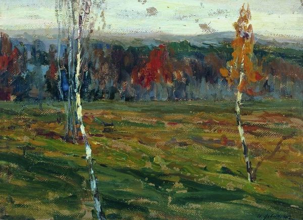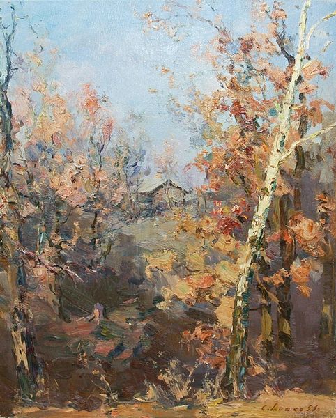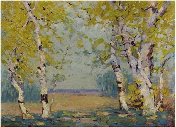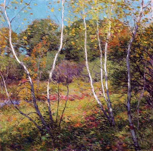 Editor: Here we have Isaac Levitan's "Autumn," painted in 1899, using oils. The immediate feeling I get is one of quiet melancholy, those slender, dark tree trunks almost like bars… What do you see when you look at this piece? Curator: Melancholy is spot on. For me, Levitan captured that bittersweet moment when the vibrancy of summer gives way, but before the starkness of winter sets in. It’s a transitional sigh of nature, if that makes any sense? Notice how he uses these vertical tree trunks, almost calligraphic in their simplicity, to create depth without really defining a foreground or background? He lets the impressionistic dabs of color do the work. Do you get a sense of the *plein air* technique? Editor: I do, especially in the looseness of the brushwork. Was Levitan part of a specific art movement? Curator: Very much so! Levitan was a key figure in Russian Impressionism. They aimed to capture light and fleeting moments of emotion, deeply tied to the Russian landscape, but with an underlying sentiment. A sort of romanticized naturalism if you will. And a big dose of mood. Editor: That's fascinating. I wouldn't have thought "melancholy" could be a national artistic trait, but it resonates, looking at the work through that lens. I guess seeing it at the Tretyakov Gallery reinforces that. Curator: Absolutely. Think of those grey Russian skies translated onto canvas – it's inescapable! It gives even the brighter gold hues a sense of introspection. But does it shift your perspective, seeing that sentiment within the *style* now? Editor: It certainly does. Now I’m not just seeing trees, but…the *feeling* of autumn. Thanks for sharing this with me. Curator: The feeling *is* the thing! And it has been a pleasure. Thanks!