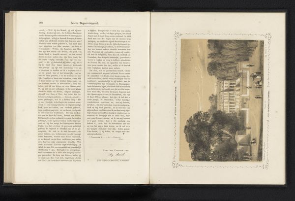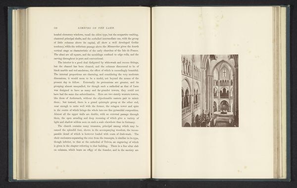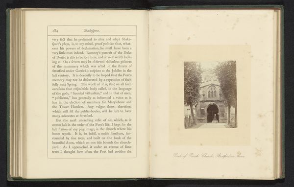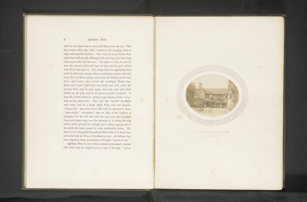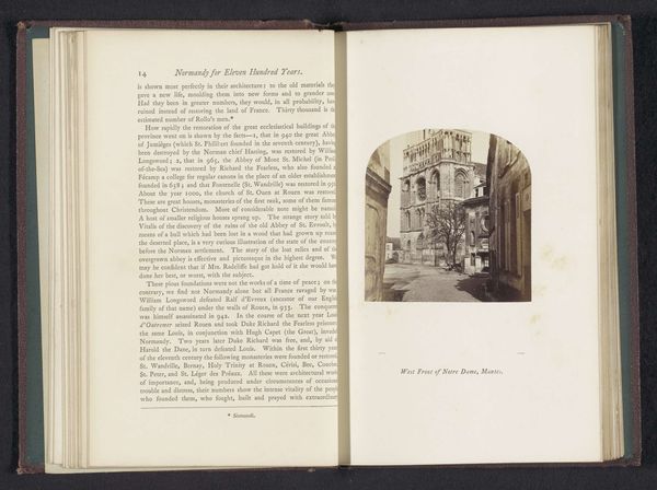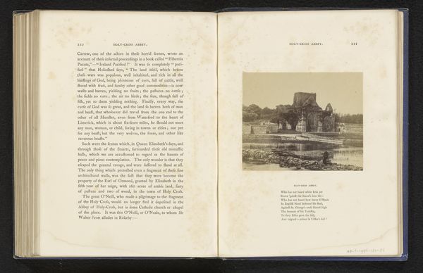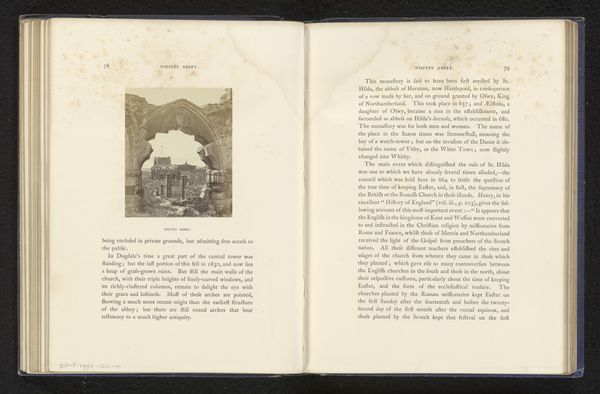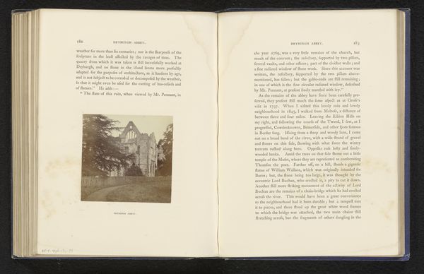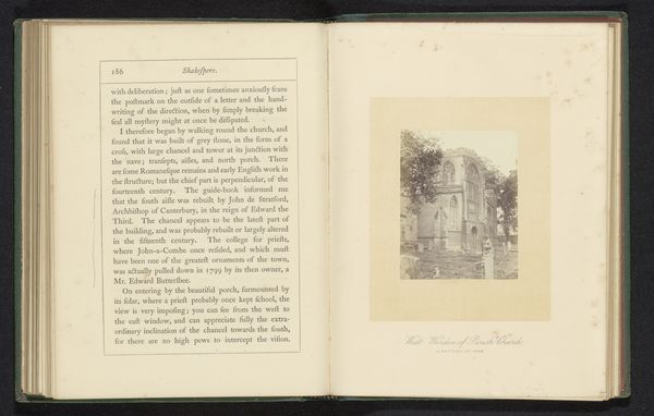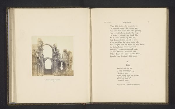 Editor: This is "Gezicht op de ruïne van Netley Abbey," which translates to "View of the ruins of Netley Abbey." It's an albumen print dating from before 1864. The artist is Stephen Thompson. I'm immediately struck by how romantic the scene feels, like something out of a gothic novel. What captures your imagination when you look at it? Curator: For me, it's that melancholic dance between nature and decay. You see the romanticism tag, and I think it fits so well. This photograph speaks to a deep Victorian fascination with ruins, a meditation on the transient nature of human achievement contrasted against the enduring power of time and nature reclaiming its own. Notice how the architecture, even ruined, frames and contains that wilderness. Do you get a sense of that intended contrast? Editor: I see what you mean! It's not just a ruin; it’s a stage for nature's performance, the broken arches framing the "scene." It almost feels like the photographer is suggesting the natural world will eventually overshadow human structures. Curator: Precisely! And consider the process itself, albumen print. It would have required skill, care and patience. Perhaps this adds another layer; humanity’s attempts to preserve and immortalize beauty always being inherently flawed and subject to their own form of decay? The crack, as in the print on the left side of this opening, seems poignant in the context of what the author has to say in words alongside it. Editor: Wow, I hadn't thought of the photographic process that way! So it’s more than just documenting a ruin; it's a reflection on time, loss, and the relationship between humans and nature. That makes this work even more powerful. Curator: Absolutely. And hopefully opens a little window into a way of seeing.