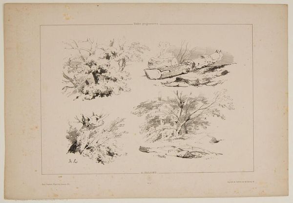 Curator: Alexandre Calame's studies, "Two Gates, a Stone Tower, and a Hillside House," presents four distinct landscape vignettes on a single sheet. What's your initial take? Editor: They feel like fleeting memories, captured in the lightest touch. The tower, especially, whispers of fairytales. Curator: Indeed. The composition hinges on the interplay of line and texture, creating depth and form through calculated strokes. The gates, for instance, demarcate space, inviting—or perhaps restricting—access to the landscape beyond. Editor: They do feel more like barriers. There is a melancholic mood with each sketch, but also a charming sense of place. Almost like each one is an abandoned setting to a fairytale. Curator: Abandonment is an interesting reading, especially considering Calame's interest in Romanticism. It encourages a search for deeper, symbolic meanings in the images. Editor: Ultimately, it's a beautiful demonstration of simplicity, a glimpse into the artist's mind, and an interesting way of showing us studies of places that have passed into legend. Curator: A fitting end to this visual analysis. Thank you.