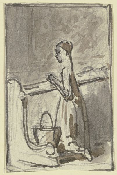 Curator: Let’s turn our attention to "Frau mit Strohbündel, die Arme in die Hüfte gestemmt," or "Woman with a Bundle of Straw, Hands on Hips," currently held here at the Städel Museum. Editor: Immediately, I am struck by its air of quiet defiance. Her pose, with hands firmly on her hips, suggests a resistance to some unspoken expectation. Curator: Indeed. The artwork, attributed to Philipp Rumpf, employs ink, gouache, and possibly Indian ink on paper, offering a study in tonal contrasts. The swift strokes capture the form and the essence of the subject and her work. Editor: Absolutely. The straw itself is depicted almost abstractly. It seems to emphasize her connection to the land and the labor from which it comes. The gendered nature of agricultural work comes to the fore. We cannot overlook how representations of women in fields throughout art history has created assumptions. Curator: And this returns to the context of its creation. The image is more of a sketch and the rough strokes may imply urgency; the finalisation of such sketches resulted from particular, material artistic labors and cultural factors. Editor: How so? Is there further socio-cultural detail implied by the use of materials and rapid sketch method here? Curator: The medium allows for the creation of multiples. Editor: I see, so it's tied to distribution in a broader sociopolitical landscape. But let's consider this further. It's not a posed studio portrait; she’s situated next to her labour, it creates intimacy. The straw is her burden and she has accepted it with integrity. I'm further compelled to think of the socio-economic implications and women’s empowerment when seeing these representations. Curator: Right. In addition to gender representation and work-place politics, what also draws me in is the deliberate composition. The straw bundle's texture versus the woman's relative form creates a visual language, reflective of artistic license in an era where rural depiction was changing rapidly. The ink washes shape form effectively. Editor: Reflecting upon our discussion, it's clear that a closer reading unveils how traditional ideas have informed current material realities of labour for rural people, especially women. Curator: Yes, from material concerns of production to critical concerns about identity and place, the artist has prompted discussions about work.