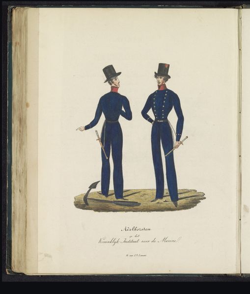 Louis Salomon Leman created this print in 1845, depicting the uniforms of Dutch naval flag officers. The image offers insight into the visual codes of power and status within the 19th-century Dutch military. Made during a period of relative peace for the Netherlands, after the Belgian Revolution, the image reflects a self-conscious desire to project strength and order. Consider how the cut of the uniforms, the gold epaulettes, and the swords, all work together to communicate authority. Note also the backdrop of ships at sea, a subtle reminder of Dutch maritime power. The institutional history of the Dutch Navy is essential for fully understanding the print's context. The Navy played a crucial role in the Dutch colonial empire, and this image can be seen as a celebration of that history and the social hierarchy that sustained it. To understand more, we can consult period documents, such as naval regulations and ship manifests. By understanding the social and institutional context, we can better understand the complex meanings embedded within this seemingly simple image.