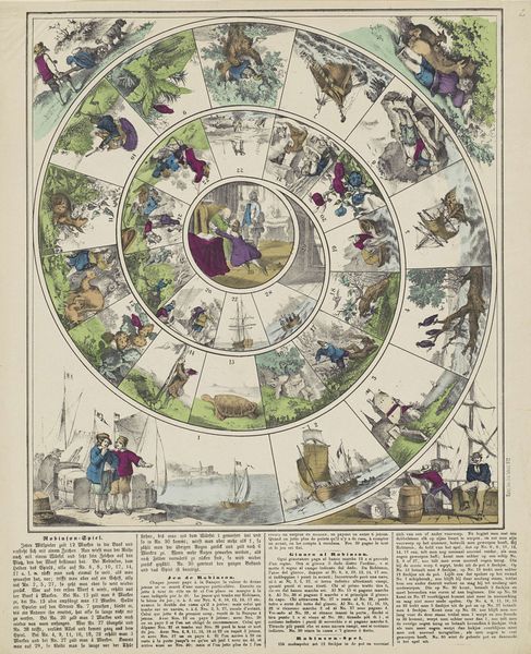 This is a color lithograph titled, “Nieuw / circus / spel,” created by S. (II) Warendorf. A spiraling form immediately captures our attention. At first glance, it’s reminiscent of a game board, filled with numbered spaces and playful illustrations of circus acts. The lithograph's formal arrangement revolves around the central spiral, a compositional choice that destabilizes traditional linear narratives. The numbers, arranged in a vortex, challenge the idea of a fixed starting point and ending, creating an open-ended structure. This hints at poststructuralist notions where meaning is not confined. The interplay between text and image further complicates interpretation. The rules and instructions at the upper left, contrast the riot of color and form in the spiral, adding a layer of semiotic complexity. What seems like a simple game board is a visual and conceptual puzzle, inviting us to consider the arbitrary nature of rules and the ever-changing nature of meaning.