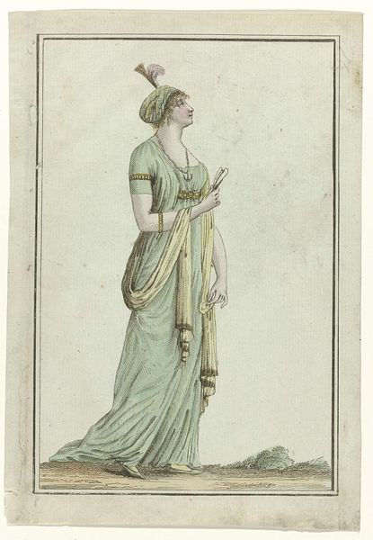 This fashion plate, created in Paris between 1783 and 1813, showcases a woman adorned in the 'à la Romaine' style. The dress evokes the simplicity of ancient Roman garments, symbolizing a connection to classical ideals of beauty and virtue. Note how the shawl features a 'tigrée' pattern, suggestive of animal markings. This motif echoes the ancient fascination with exoticism and power, linking back to images of deities and rulers draped in animal skins, signifying dominance and a connection to the natural world. Think of the leopard skin worn by Dionysus, a symbol of untamed energy, or the lion skin of Hercules, representing strength and heroism. The fan she holds is reminiscent of wings, a symbol deeply embedded in the human psyche, representing aspirations, freedom, and spiritual ascension. This imagery invites a deeper contemplation of the human desire for transcendence, a theme that consistently resurfaces through the ages, constantly evolving in meaning.